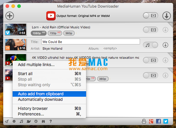 该程序会密切注意剪贴板,并在其中找到受支持的链接后,便会自动将该视频添加到下载队列中。