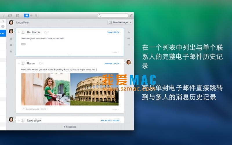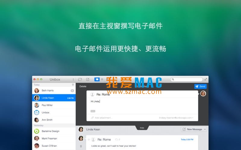 Unibox for Mac 是一套电子邮件客户端软件,可将您的消息按接收者分组,之后您的电子邮件自动得到整理,让您易于寻找。