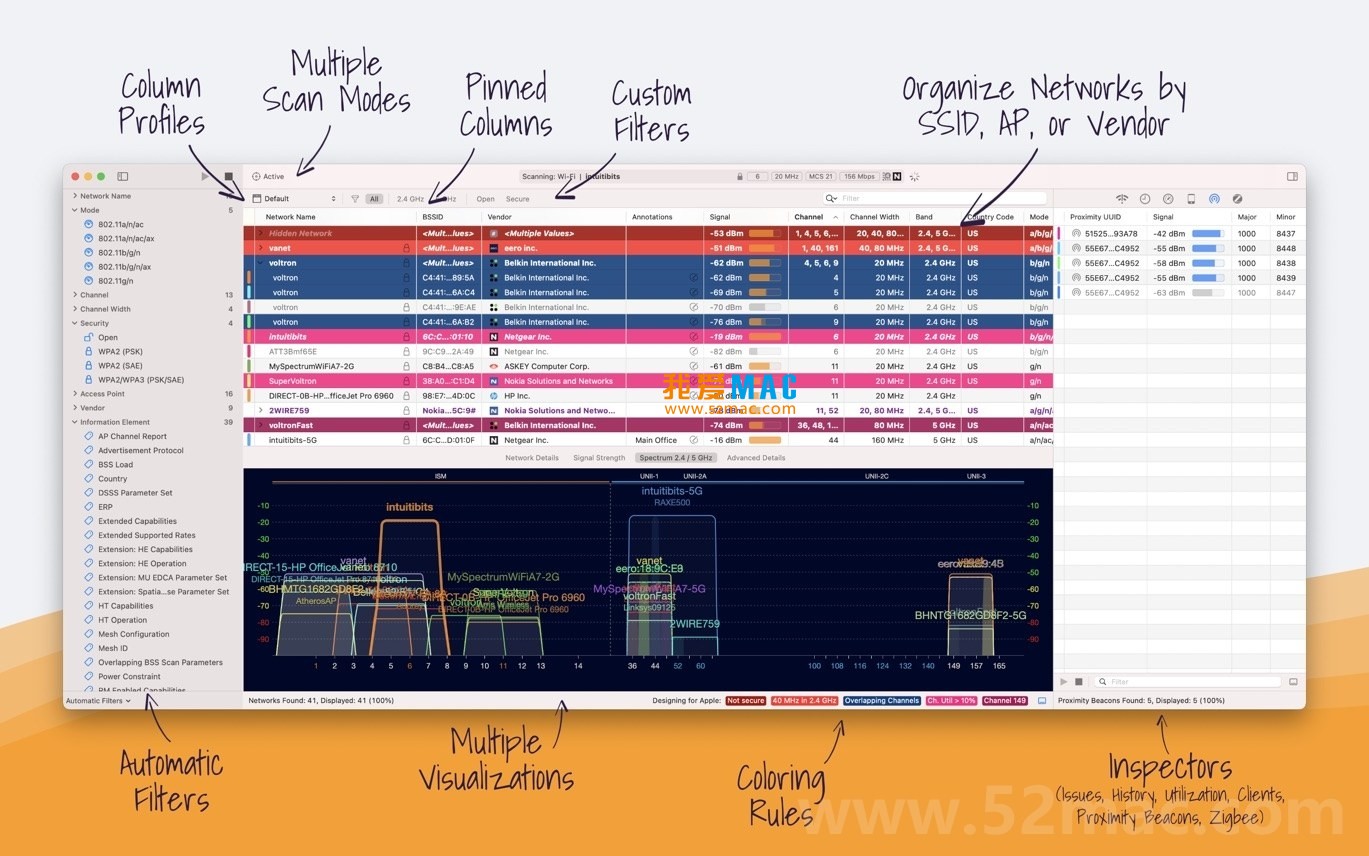 WiFi Explorer Pro 3 for Mac 是一个Wi-Fi扫描器和分析器,用于协助WLAN和IT专业人士设计、验证和排除无线网络故障。