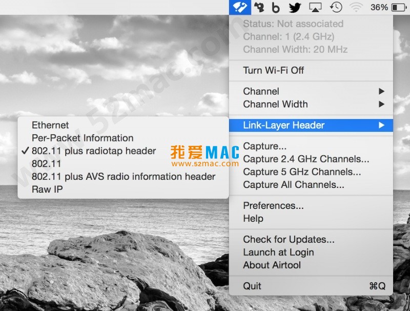 Airtool是一个系统菜单栏应用程序,它提供基本功能来检查内置Wi-Fi适配器的状态和通道配置,以及在单个和多个通道上执行帧捕获。它可以与Wireshark一起使用,以使您在执行实时帧捕获时更改通道设置。