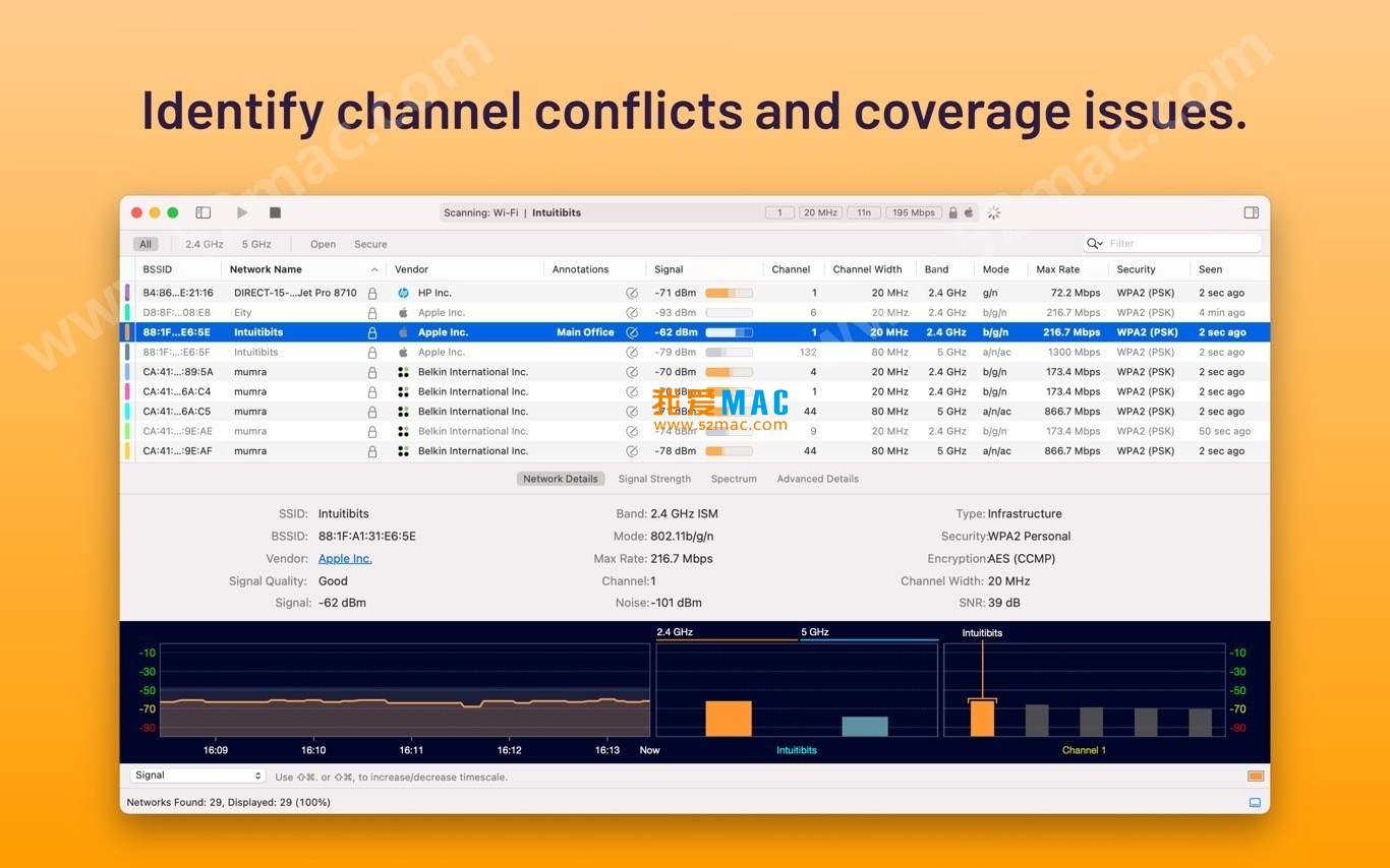 传统的Wi-Fi扫描仪仅向您提供附近网络的基本信息。WiFi Explorer Pro不仅可以为您提供一系列专家功能,还可以帮助您分析和评估家庭,小型办公室和企业网络。