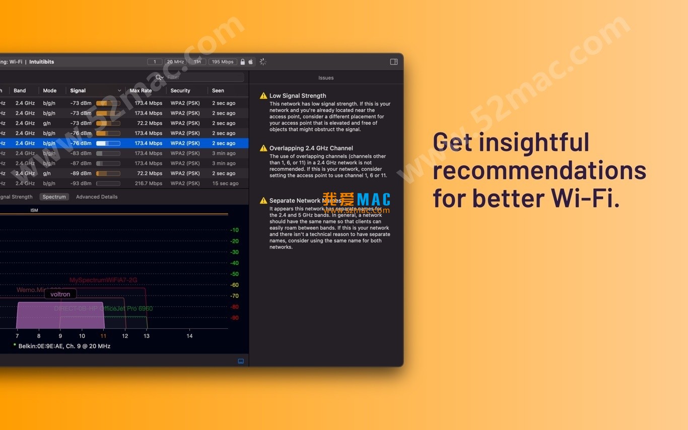 WiFi Explorer Pro中的频谱分析集成使您可以可视化RF信息,并将其与Wi-Fi数据关联,以识别非802.11能源,并更好地了解无线网络上干扰和信道利用率的影响。