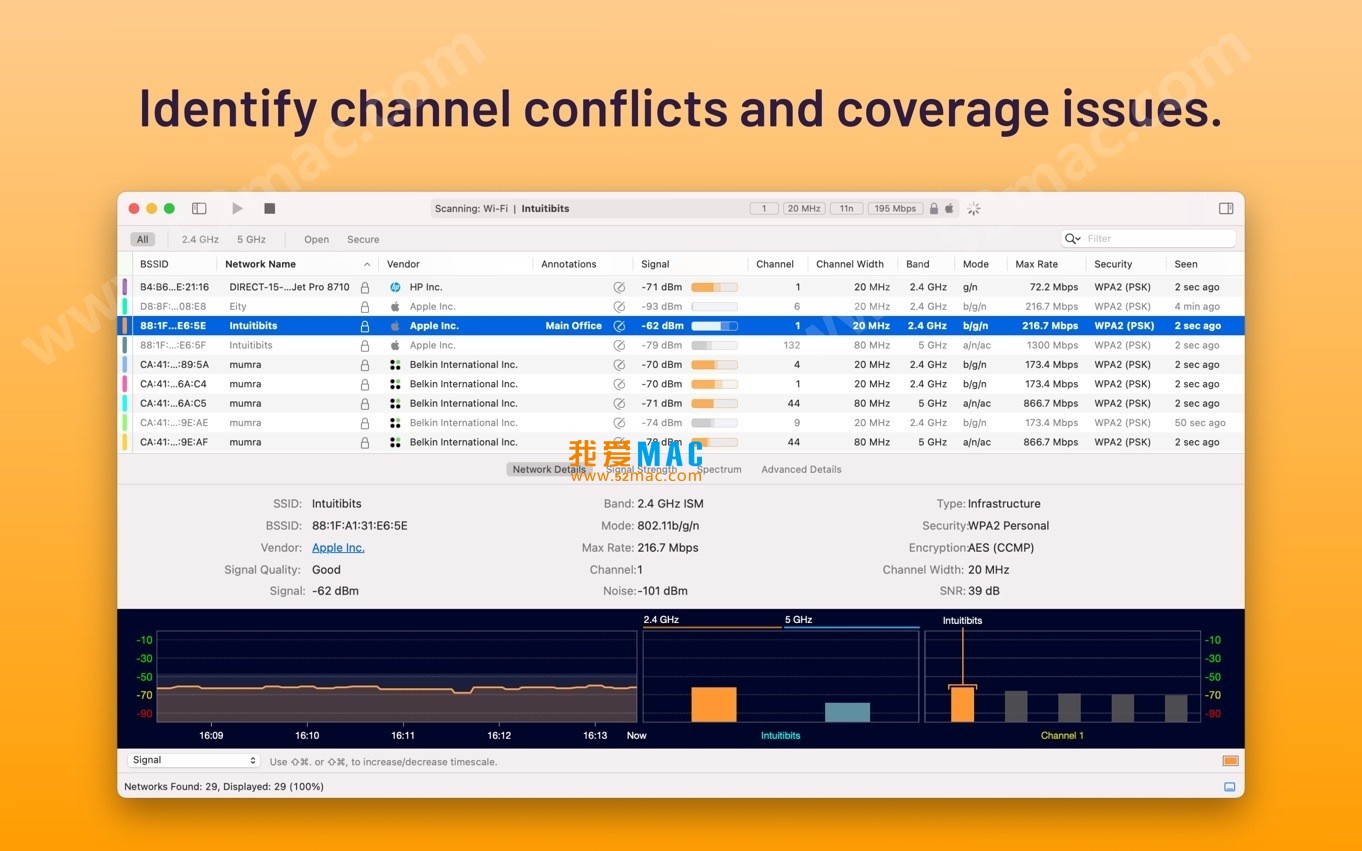 WiFi Explorer Pro中的频谱分析集成使您可以可视化RF信息,并将其与Wi-Fi数据关联,以识别非802.11能源,并更好地了解无线网络上干扰和信道利用率的影响。
