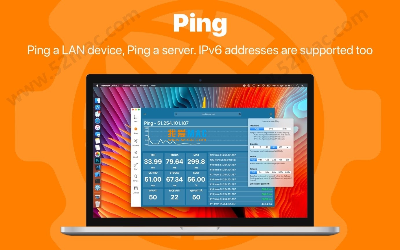 局域网设备,Ping服务器,ping任何你想要的。也支持IPv6地址,并且可以使用诸如数据包大小,超时,间隔等高级选项,并且可以轻松配置。