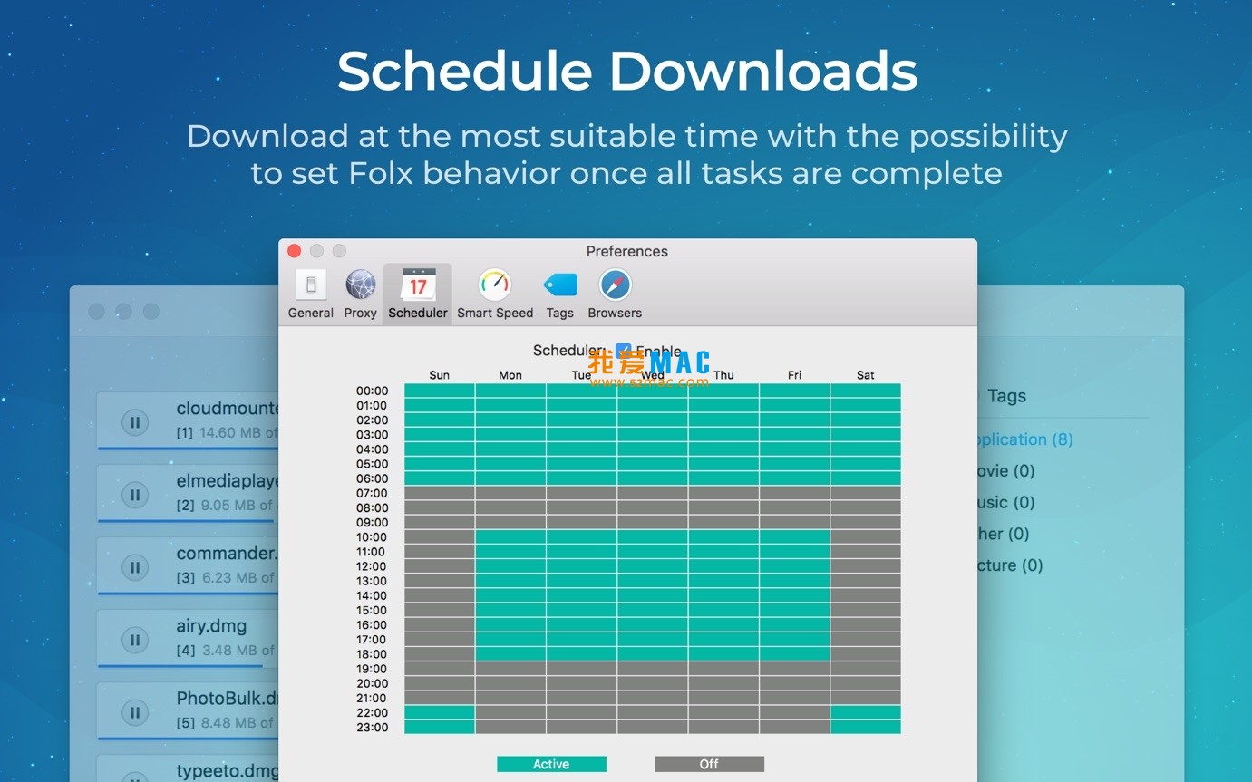计划下载:用户可以设置下载任务的开始和结束时间,还能选择在下载完成后让电脑关机、进入睡眠模式或退出 Folx Pro,便于在网络低谷期或夜间进行下载,节省时间和网络资源。