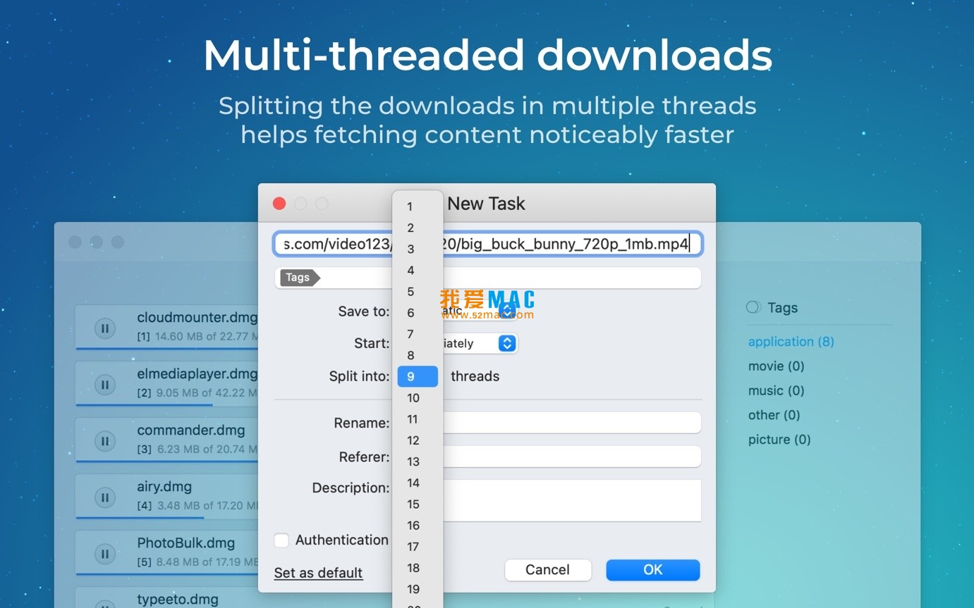 多线程下载:能将下载任务分割成多达 20 个线程,大大提升下载速度,特别是在处理大文件时效果显著。