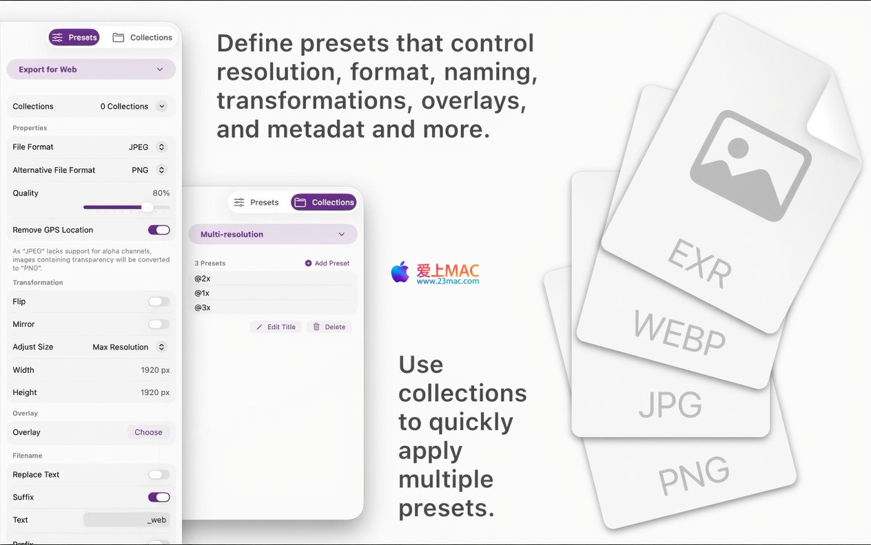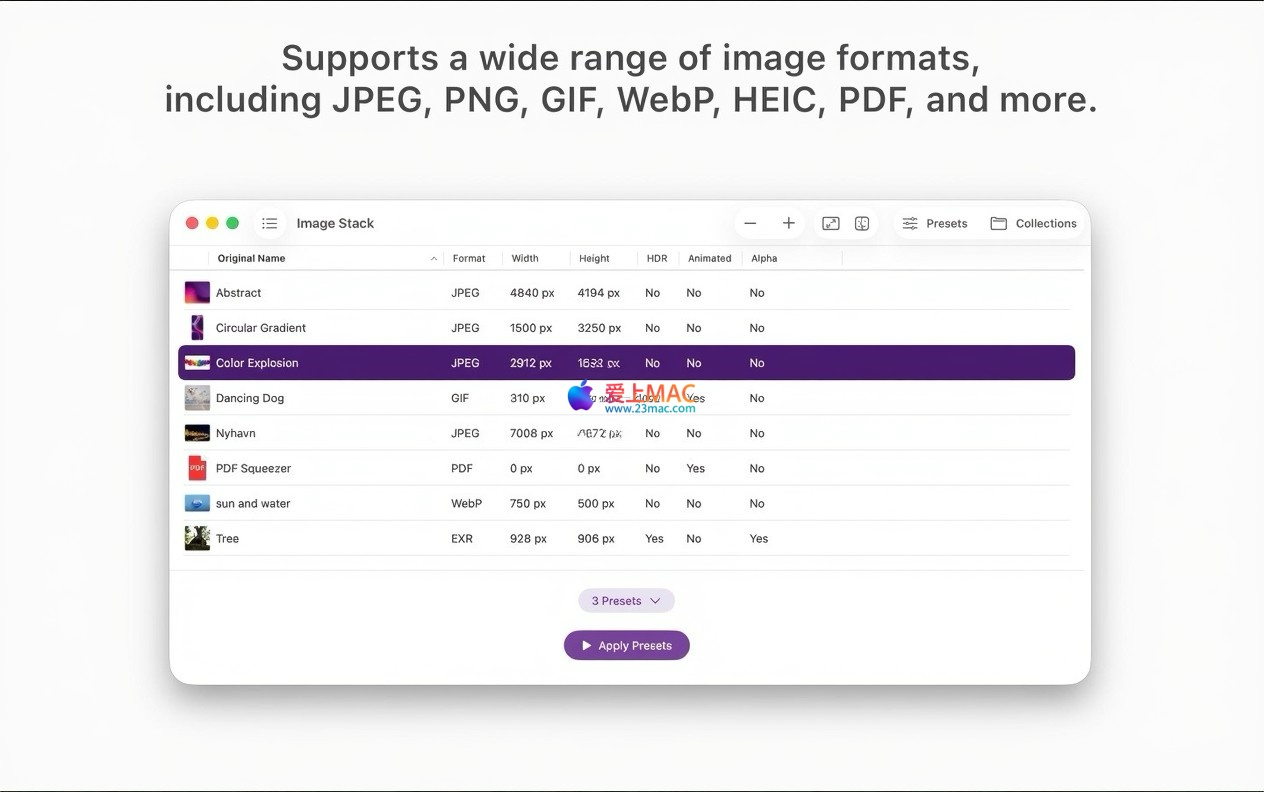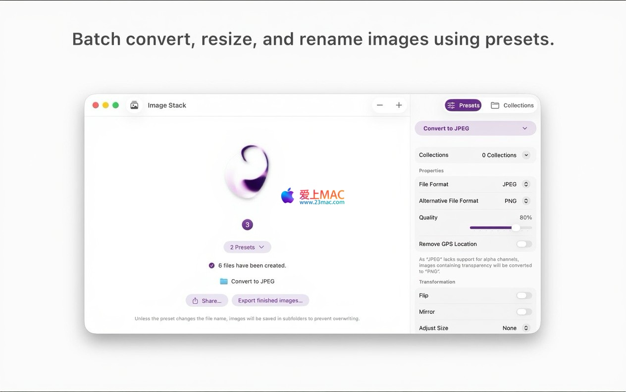 Image Stack 是一款专业的图像批量处理软件,它通过预设功能,让格式转换、尺寸调整、文件重命名等繁琐操作变得简单高效。无论您需要处理单张图片还是数千张图片,只需轻点几下即可快速完成所有任务。