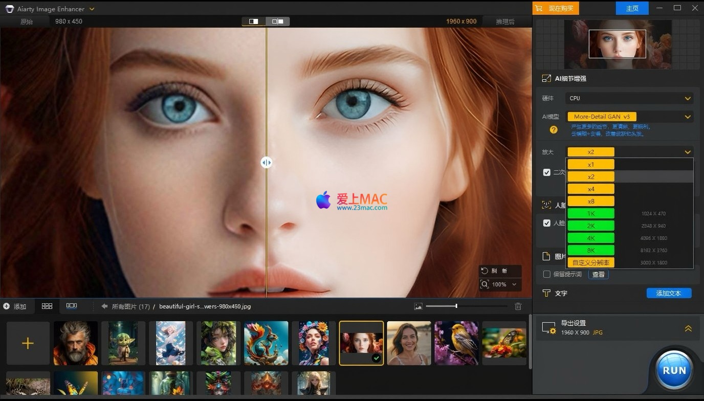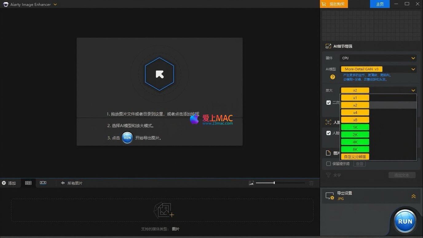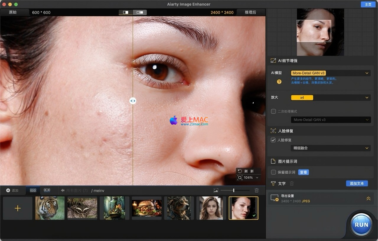 Aiarty Image Enhancer for Mac 是一款基于前沿生成式人工智能技术的专业图像处理软件。它能够智能地执行图像去模糊、降噪、修复与无损放大等核心功能。通过运用先进的AI模型,该软件可为图像生成逼真的细节,显著提升画面的清晰度、锐度与整体视觉质量。