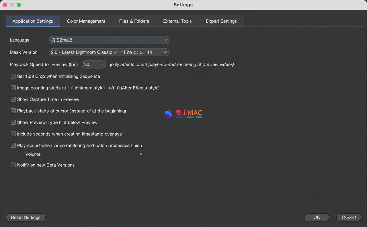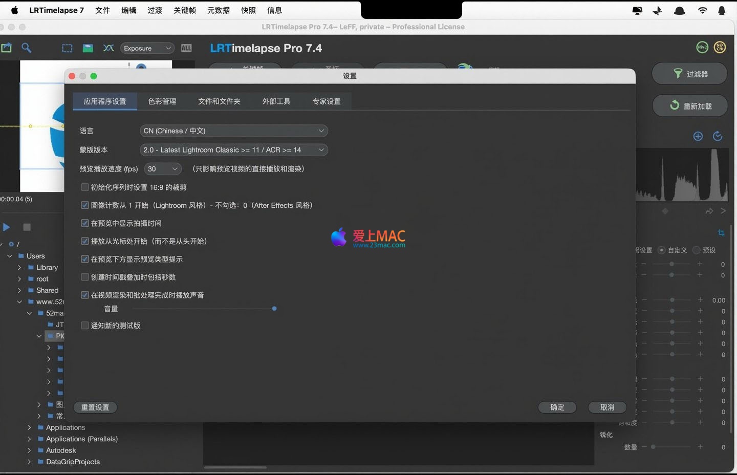 软件首次启动默认为英文界面。如需切换为中文,请点击左上角菜单栏的「LRTimelapse 7」→「Settings…」,在设置面板中选择「中文」即可。