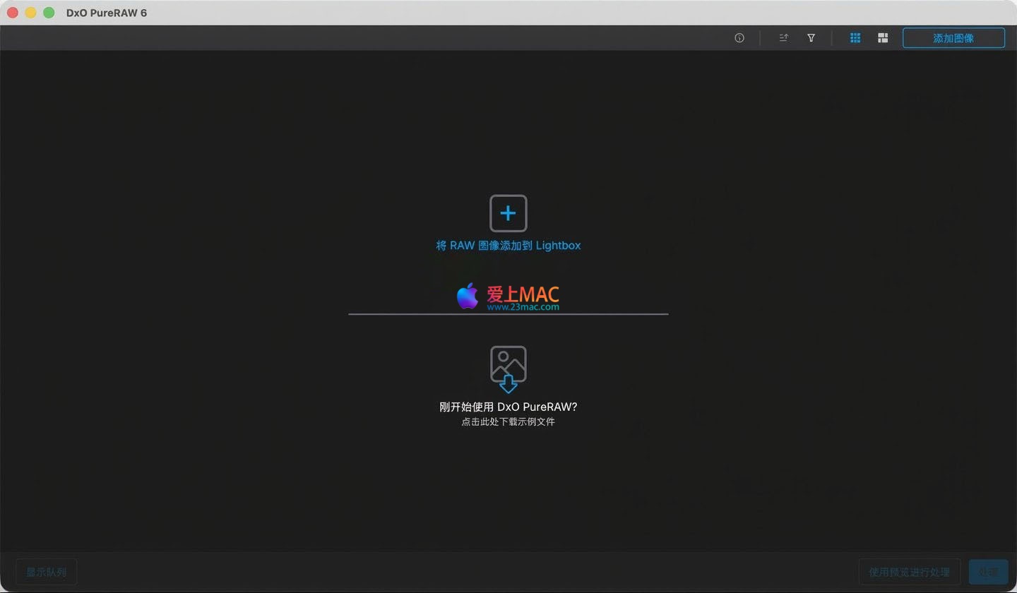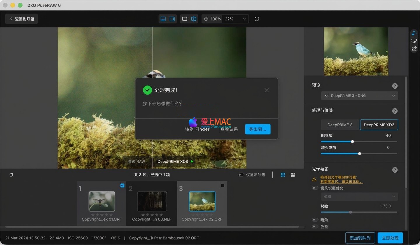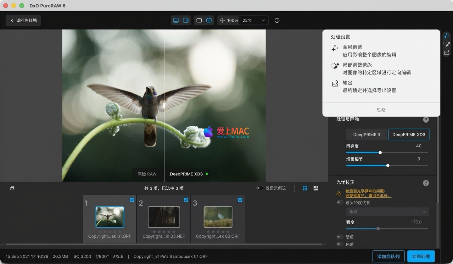 以下是 DxO PureRAW 6 for Mac 的软件界面截图,展示了其直观的工作流程与处理选项: