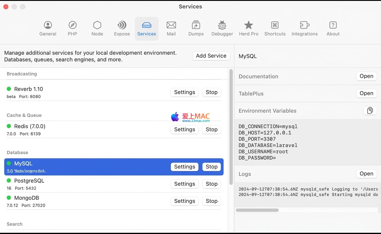 *.test 域名路由至本地对应项目,无需手动修改 hosts 文件。通过可视化控制面板,原生支持以下服务的一键安装、启动与管理: