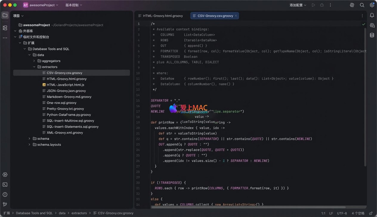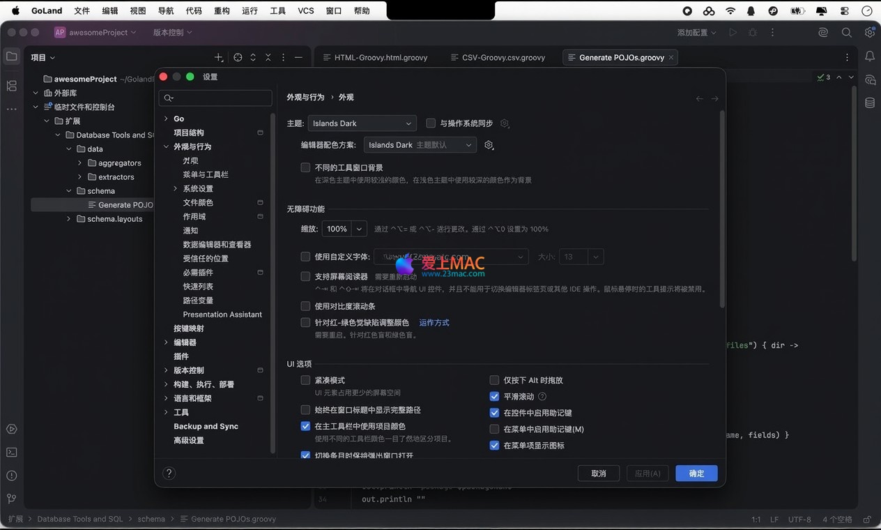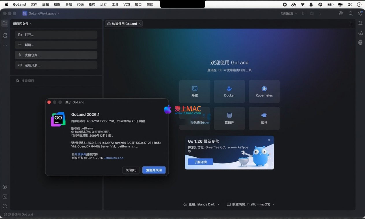 .dmg 磁盘映像文件。以下是 GoLand 在 macOS 上的典型工作界面,展示了其清晰的代码编辑区、集成的工具窗口和现代化的用户界面。