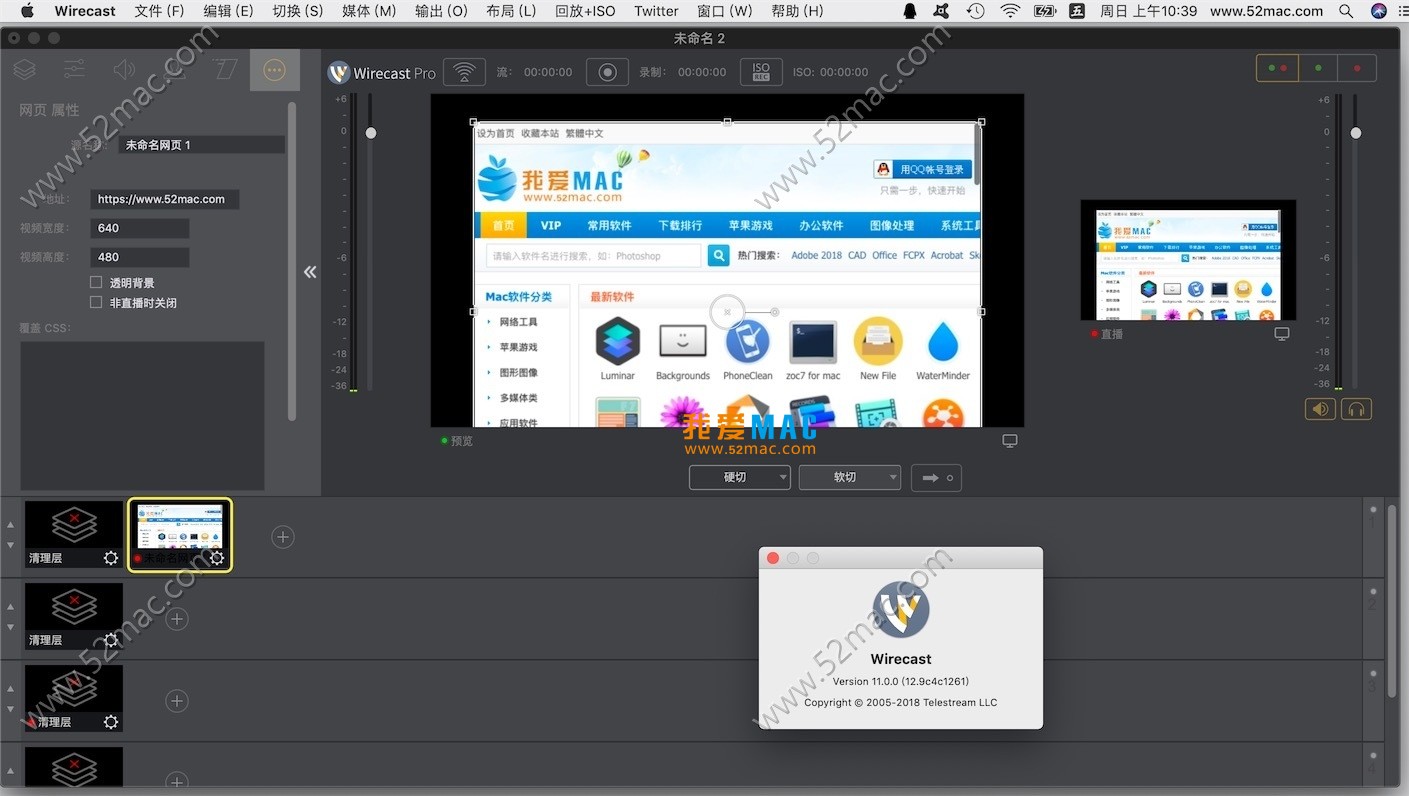 以下是 Wirecast Pro for Mac (版本 11.0.0) 的软件界面示意图,展示了其工作区布局与功能模块: