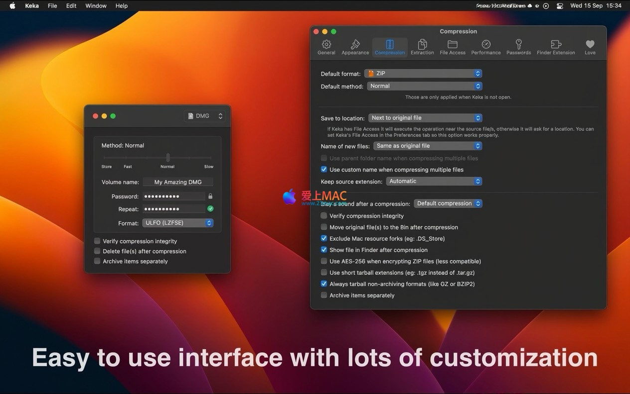 以下为 Keka for Mac v1.6.1 版本的应用程序界面截图,展示了其主窗口、偏好设置及操作流程。