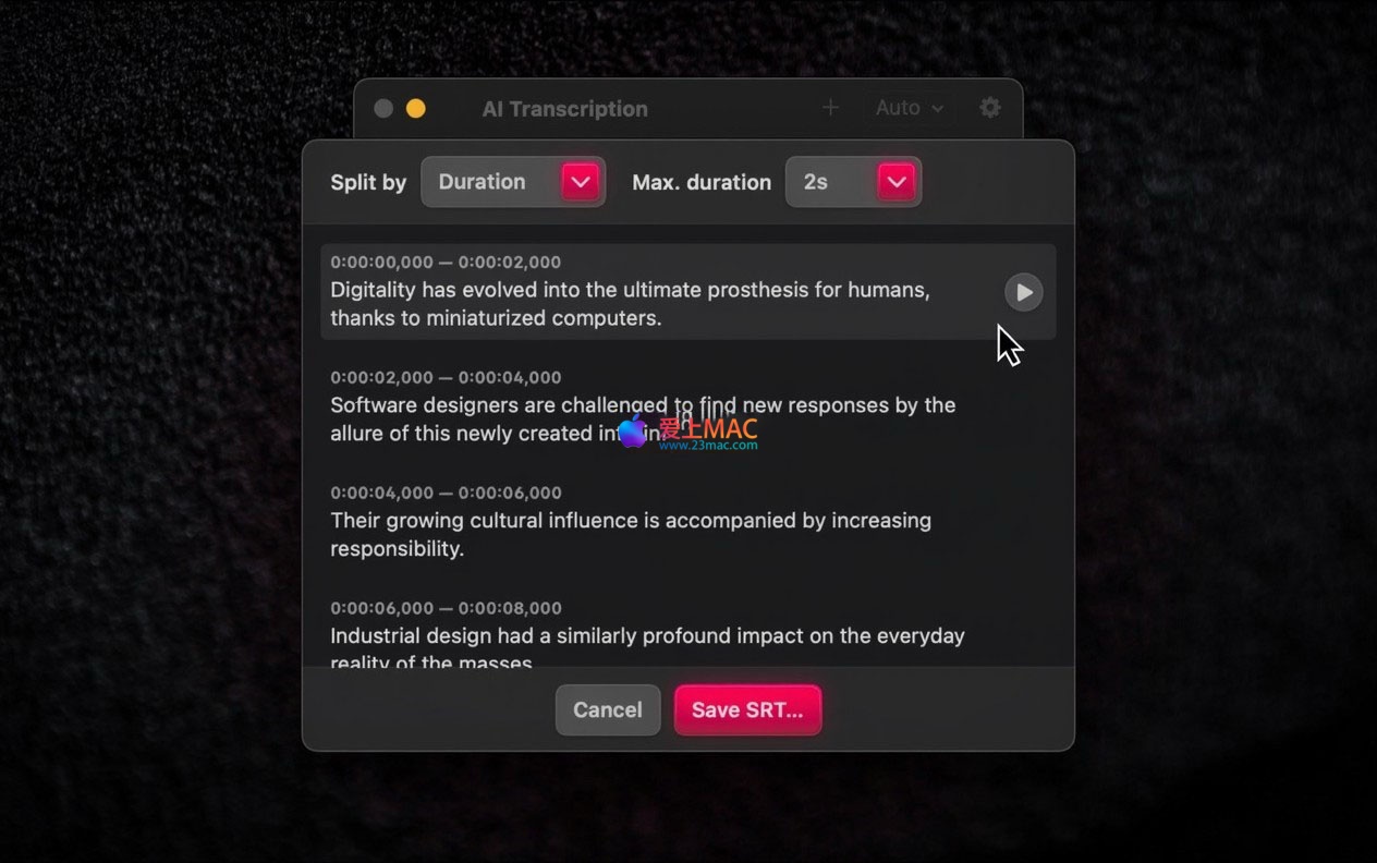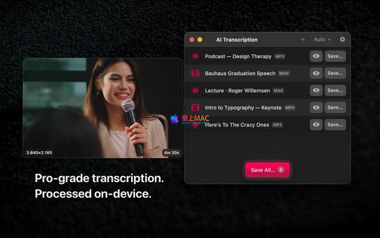 AI Transcription for Mac 是一款能够瞬间自动、离线完成音视频文件转录的应用程序,并提供高准确度的文本结果。它集成了 OpenAI 的 Whisper 技术与 Apple 语音识别引擎,可将播客、演示文稿、讲座、语音消息等多种语音内容,高效转换为文本及字幕文件。