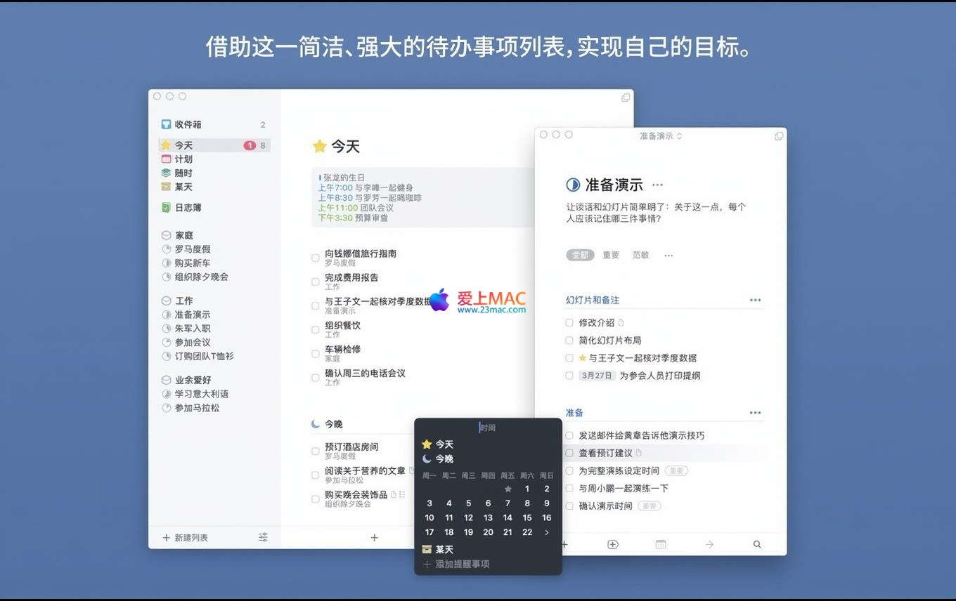 Things 3 帮助您跟踪项目相关任务,并通过标签、项目分类和职责范围进行高效组织。其主要功能包括: