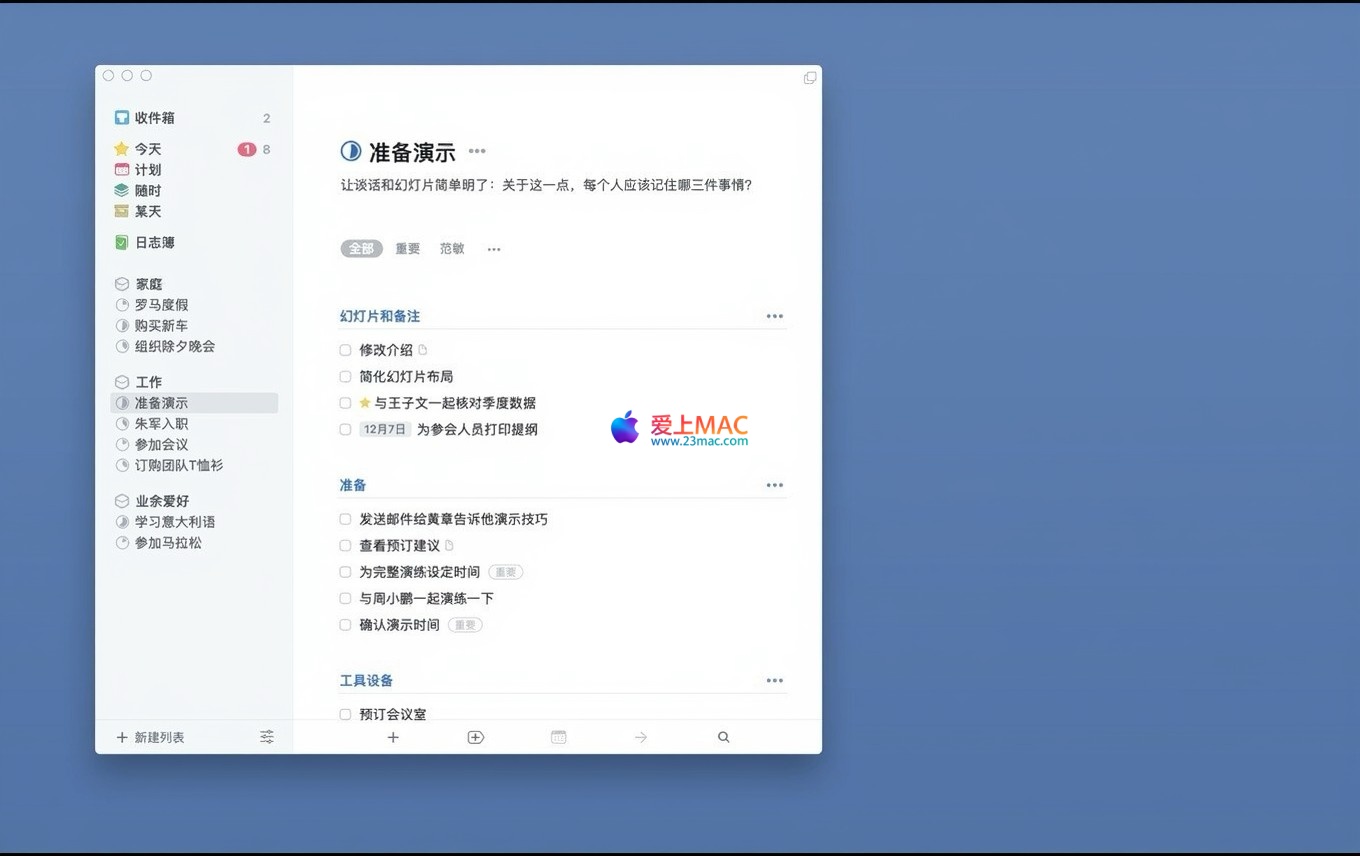 Things 3 是一款专为 macOS 设计的时尚、直观的任务管理应用程序。它支持用户根据多种条件创建、筛选和组织任务,尤其适合项目繁忙、需要精细规划的专业人士。