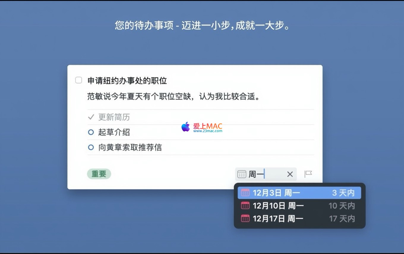 您可以在“收件箱”中快速添加新任务,并为其设置标题、标签、优先级、注释和截止日期。该应用也支持重复任务设置。