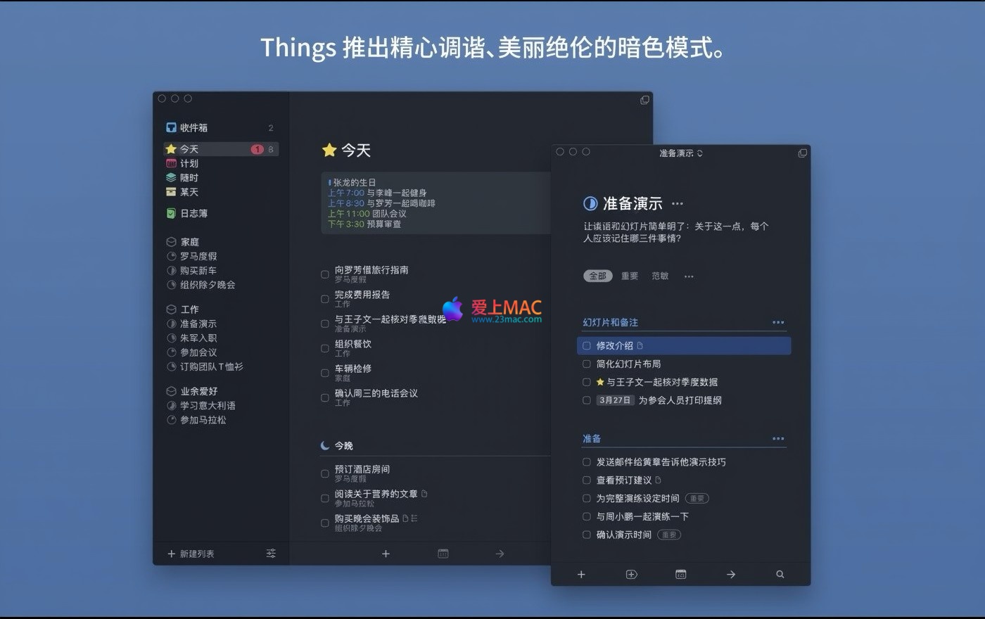 Things 充分利用 macOS 的系统特性,提供深度集成体验:支持从其他应用快速创建待办事项、完美连接系统日历、启用通知中心小组件、从“提醒事项”App导入数据。对于高级用户,还提供了全面的 AppleScript 支持,以满足复杂的自动化工作流需求。