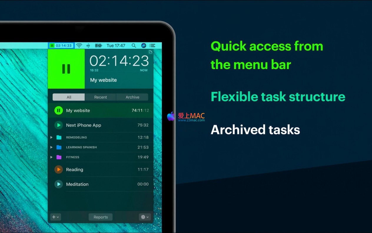 可直接从菜单栏快速启动和切换计时任务,全程无干扰。支持根据任务、项目或客户自由组织工作结构,无需遵循固定模板。用户可自定义颜色标识,归档已完成项目,并随时回溯历史记录。