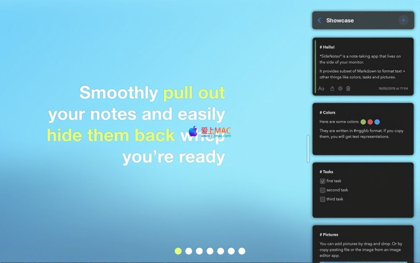 以下为SideNotes for Mac v1.2.1的软件界面截图,展示了其简洁的侧边栏设计及多功能编辑界面: