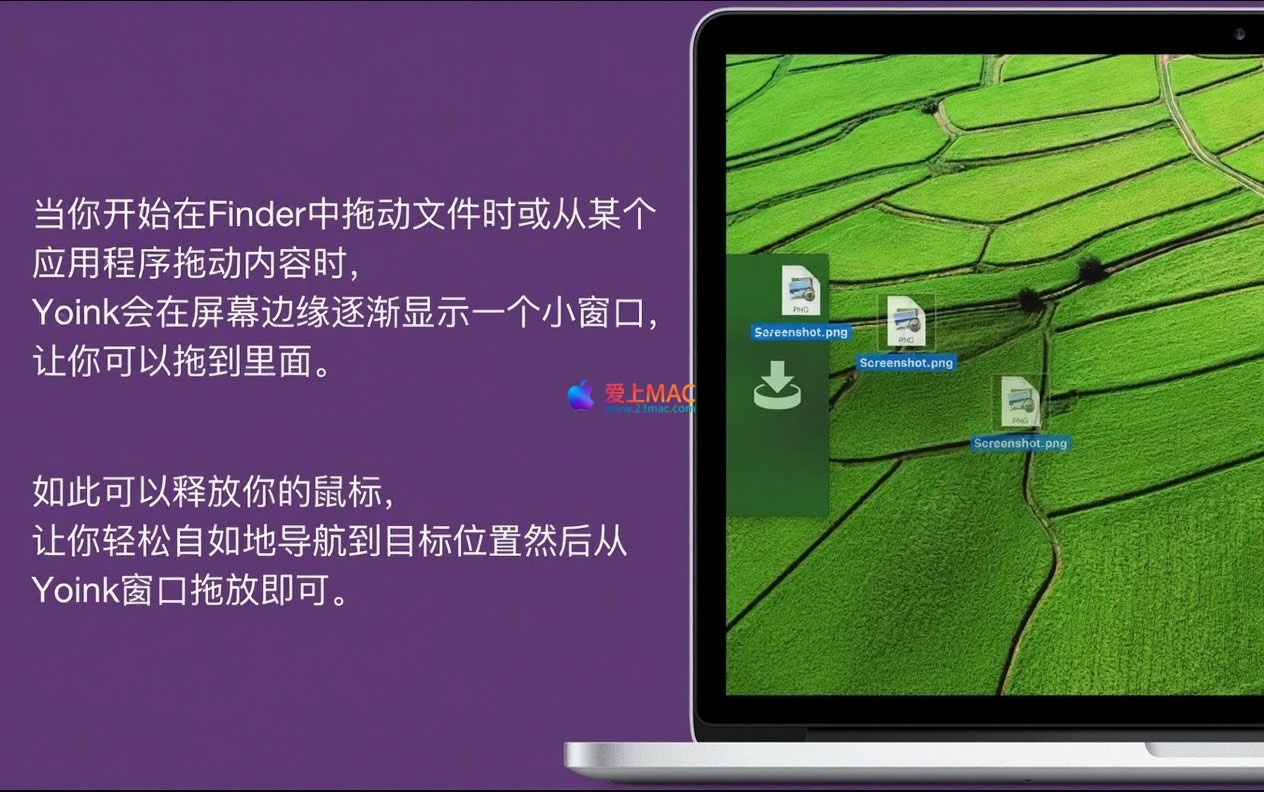 当您在 Finder 或任何应用程序中开始拖动文件、图片或文本等内容时,Yoink 会自动在屏幕边缘(可自定义位置)滑出一个简洁的悬浮窗口。