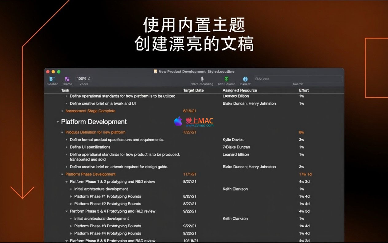 OmniOutliner Pro 5 不仅适用于起草任务清单、会议议程和笔记,更能胜任活动策划、日记撰写、剧本创作等需要高度结构化文本的复杂任务。