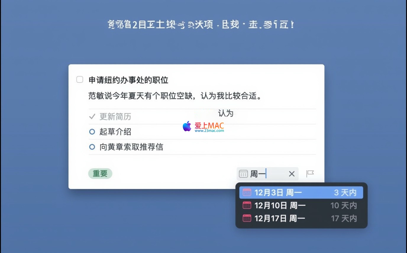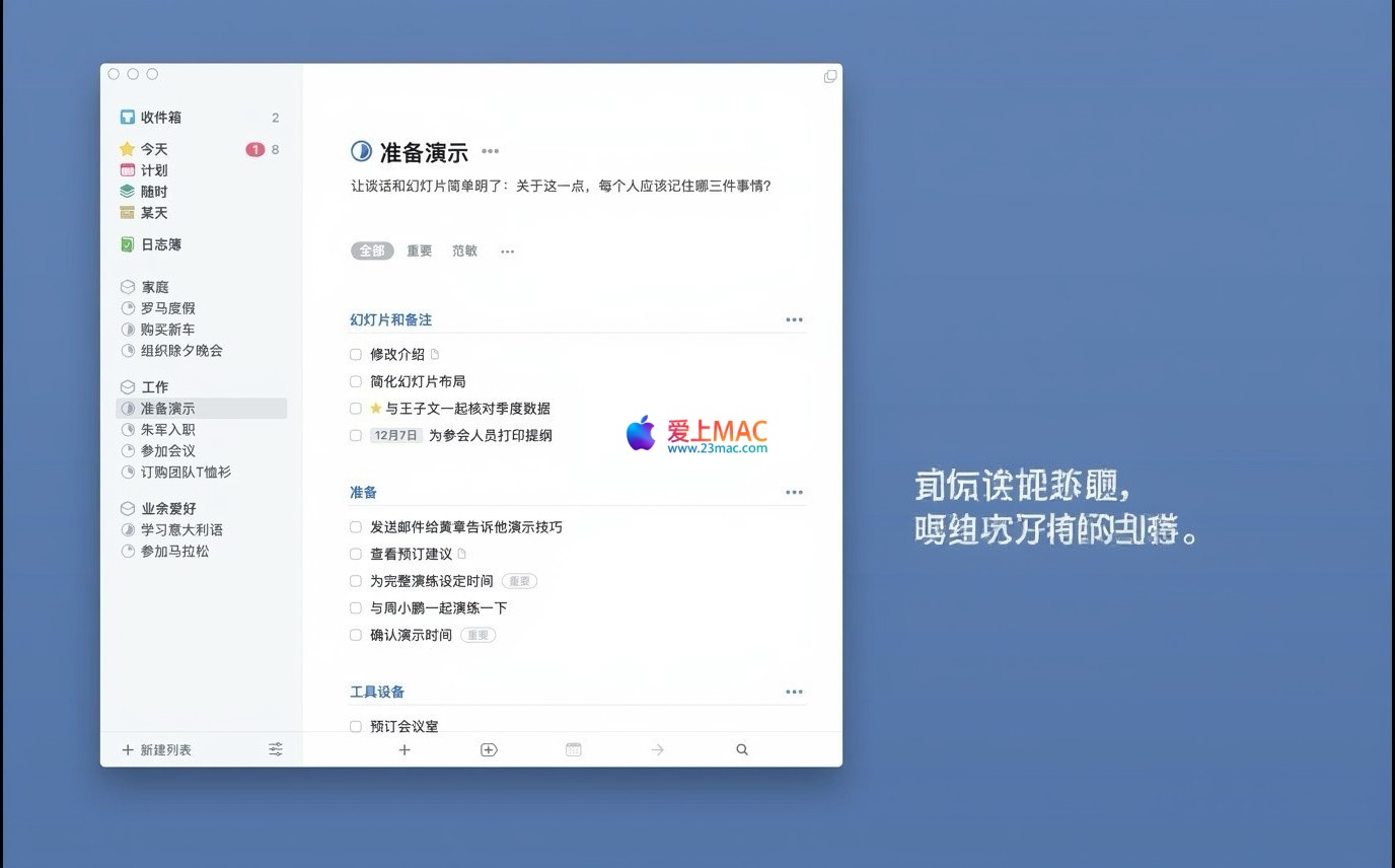Things 3 是一款专为 macOS 设计的时尚、直观的任务管理应用程序。它支持用户根据多种条件创建、筛选和组织任务,尤其适合项目繁多、日程紧凑的用户,帮助其清晰掌握项目进展与待办事项。