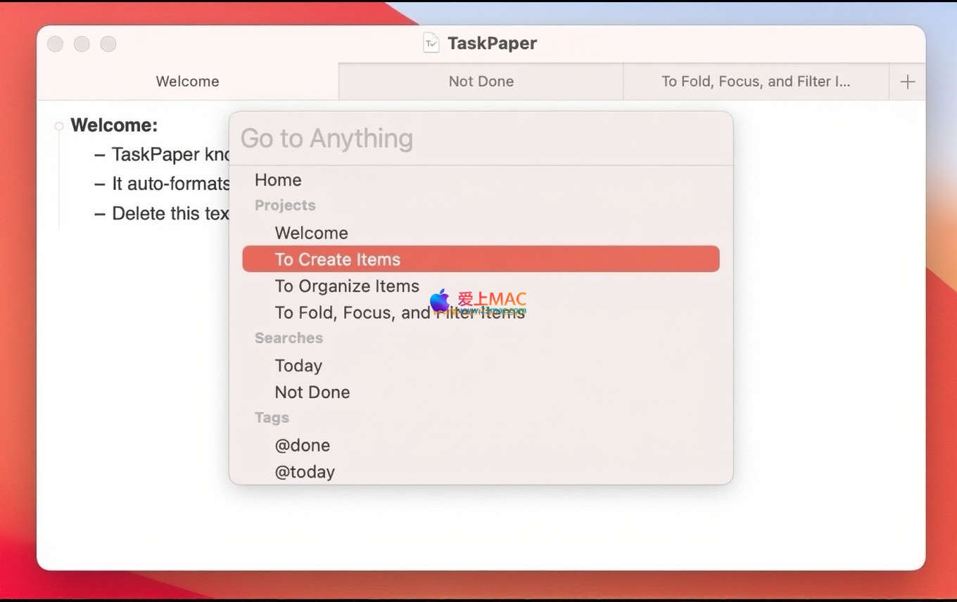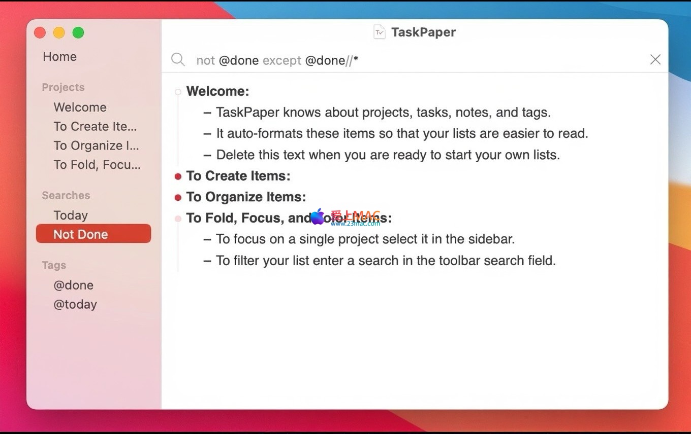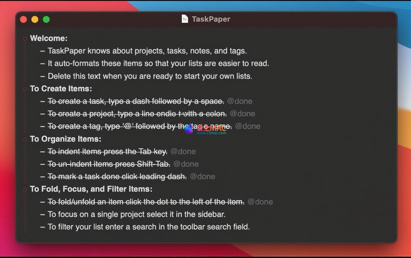 TaskPaper for Mac 是一款专注于纯文本的待办事项列表管理软件。其最新版本 TaskPaper 3 在继承自2006年以来经典设计理念的同时,进行了全面革新,保持了核心的简洁性与高效性。