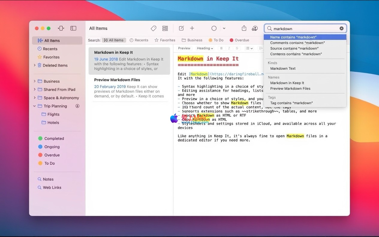 Keep It for Mac 是一款集笔记、剪贴簿与文件管理器于一体的专业工具,旨在帮助用户高效地记录笔记、保存网页链接、存储文档、图像及各类文件,并能快速精准地重新定位所需内容。作为经典应用 Together 的继任者,Keep It 是您所有需要妥善保存并确保未来可随时找回的信息与文件的理想归宿。