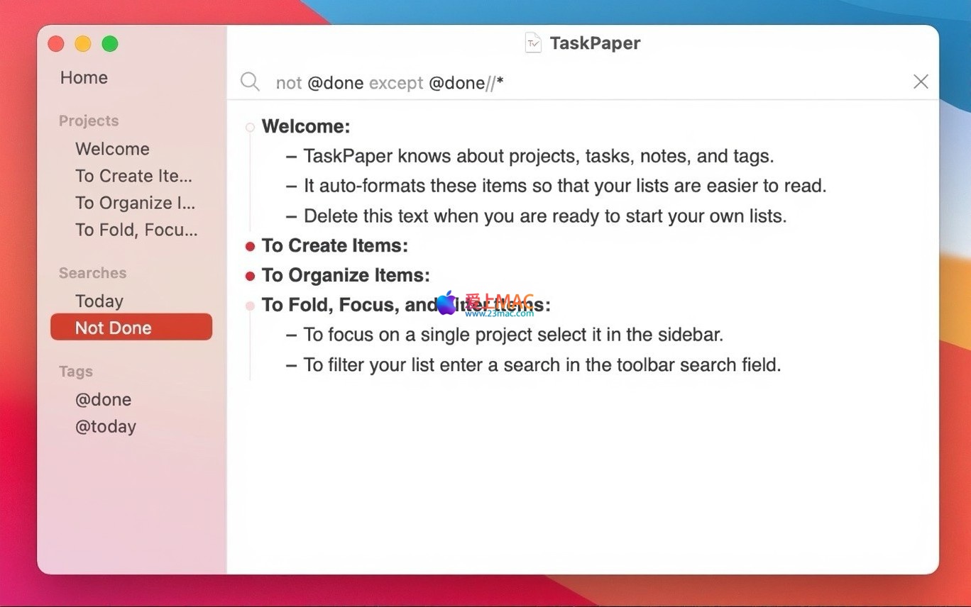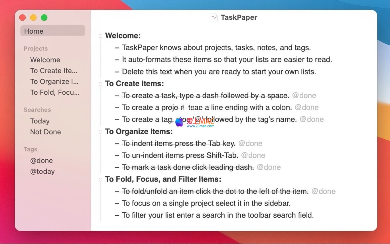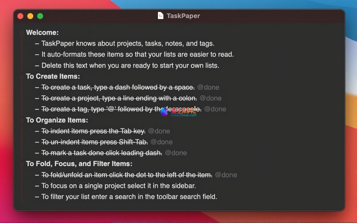 TaskPaper for Mac 是一款专注于纯文本的待办事项列表管理应用。其最新版本 TaskPaper 3 在全面革新的同时,依然秉承了自2006年初代产品以来广受好评的纯文本设计哲学,确保了核心工作流的简洁与高效。
