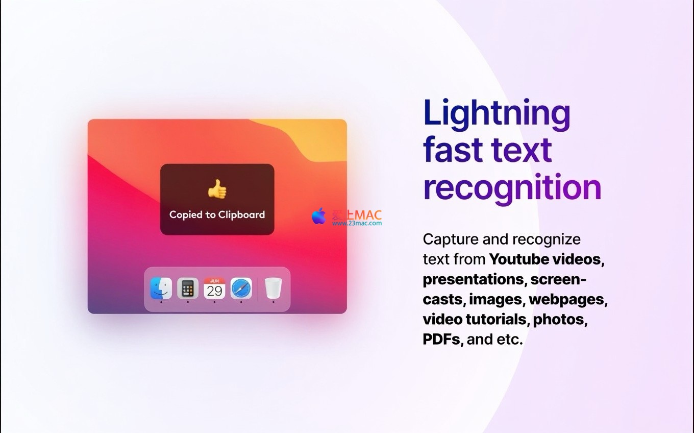 该工具设计直观,无需专业培训或特殊技能,即可轻松从图像、扫描文档、PDF文件乃至视频画面中提取文本。其简洁的用户界面和便捷的菜单栏访问方式,使其成为家庭及企业Mac用户的理想选择。