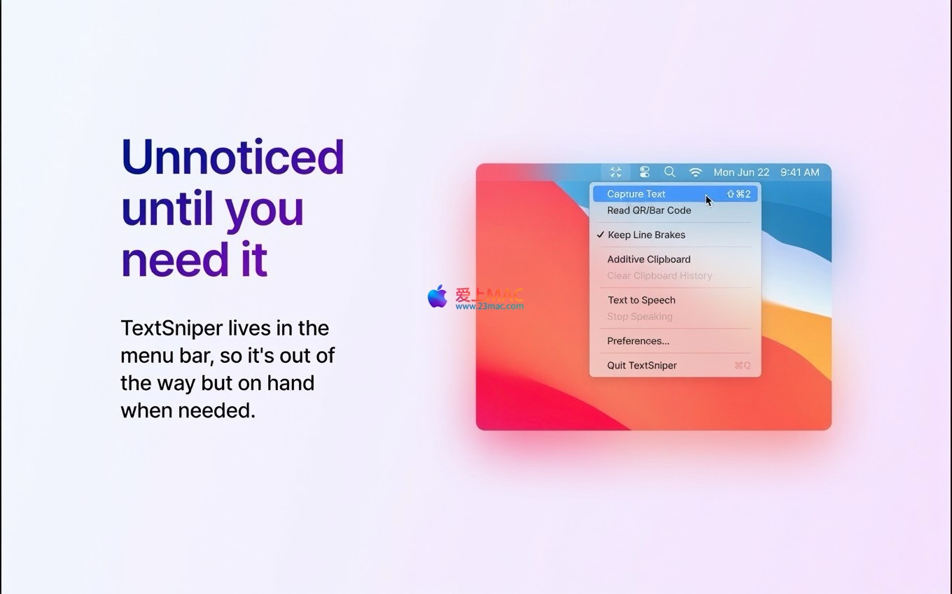 TextSniper 是一款适用于macOS系统的桌面OCR(光学字符识别)应用程序。它能够快速、准确地从屏幕上任何不可搜索或不可编辑的文本源中提取并识别文字。作为一项增强功能,该软件还支持将识别出的文本转换为语音输出。相较于其他复杂的OCR工具,TextSniper以其便捷性和高效性,为用户提供了出色的使用体验。