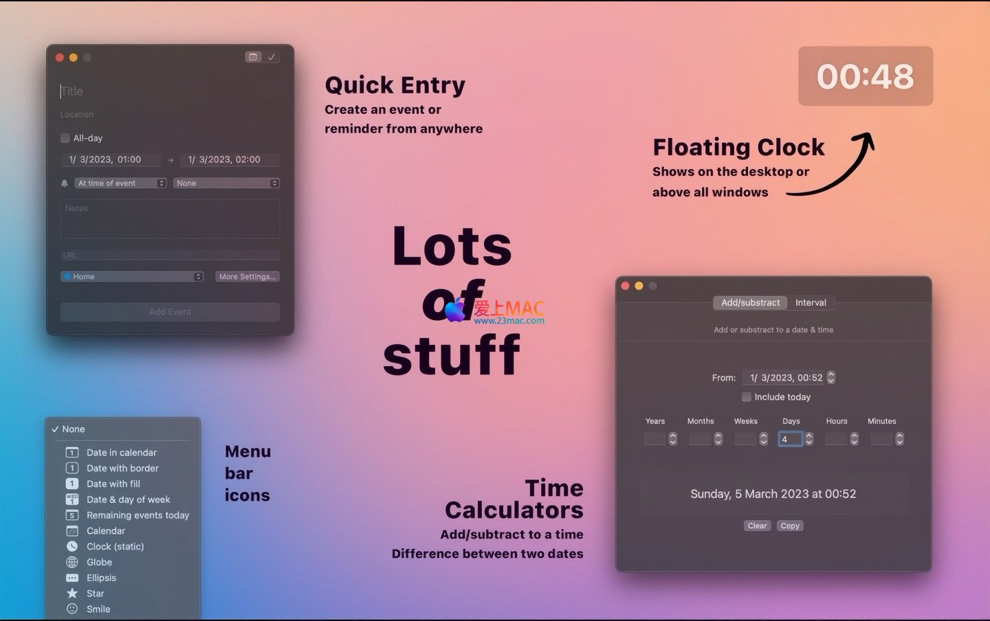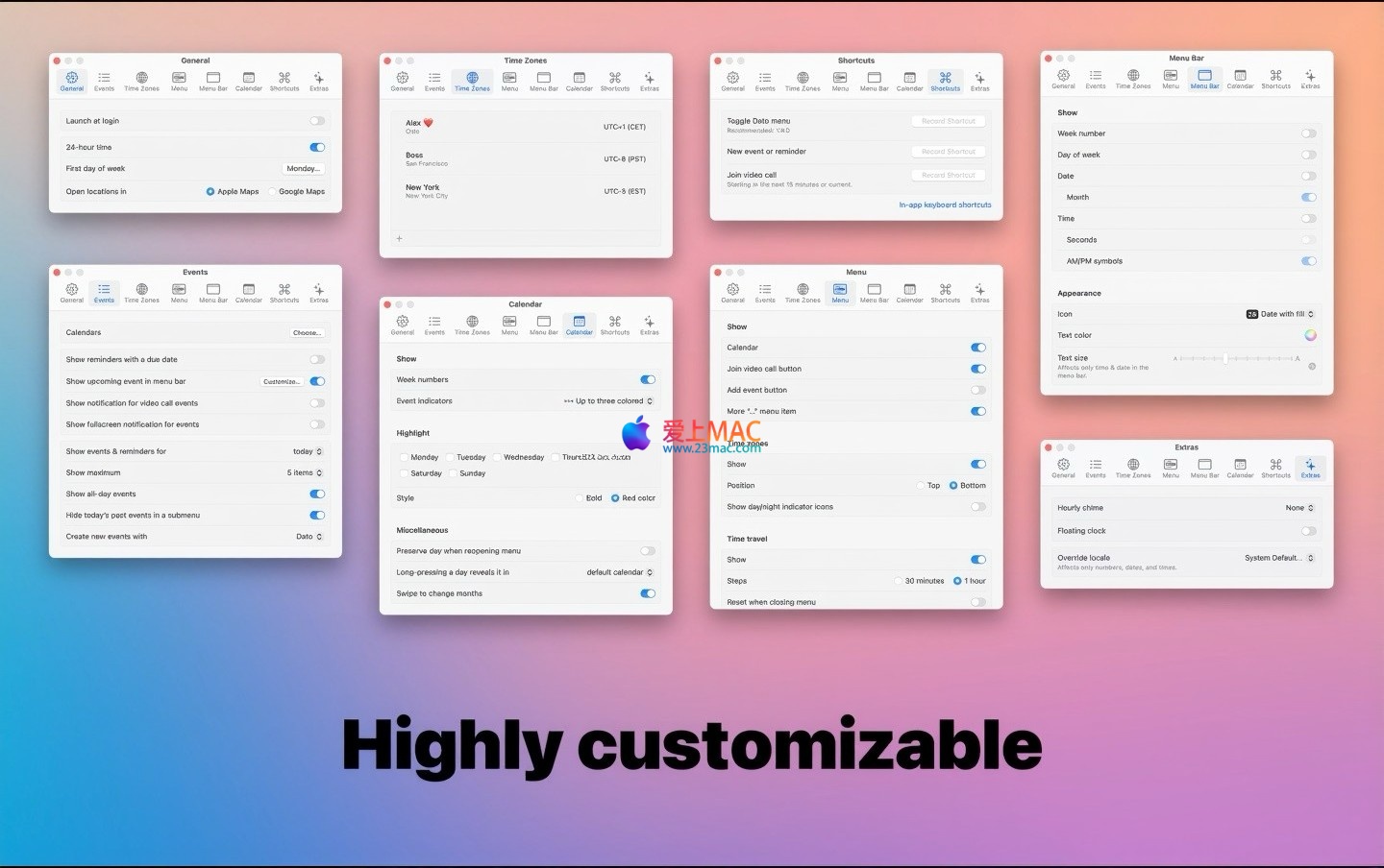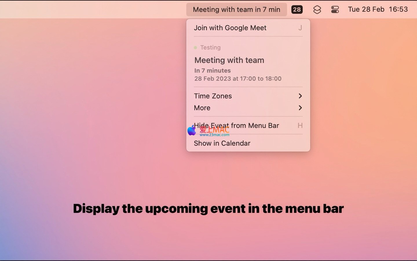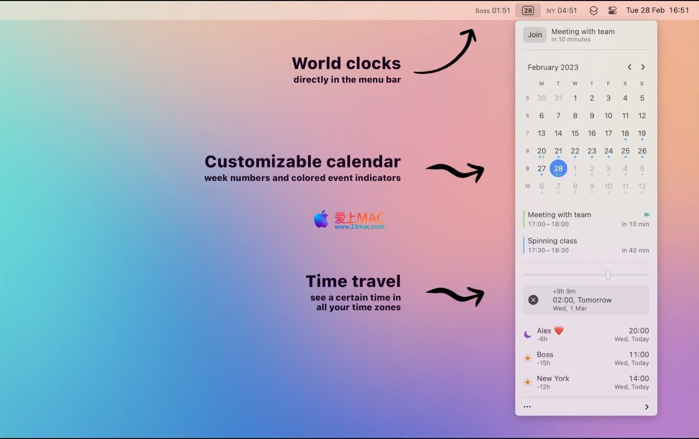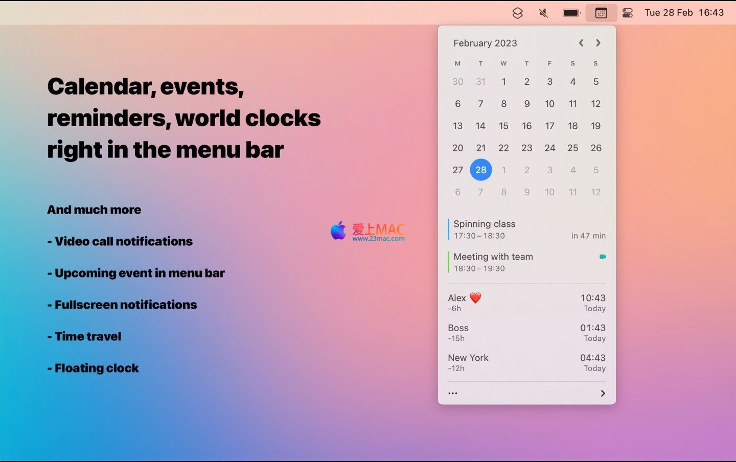 Dato for Mac 是一款集成于 macOS 菜单栏的实用工具,为您提供本地时间、日期、多时区世界时钟以及近期日历事件的概览。点击菜单栏中的 Dato 图标,即可展开一个高度可定制的菜单,其中包含日历视图、事件列表和世界时钟。