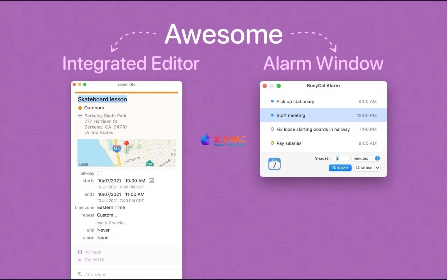 提醒以可移动、可调整大小的浮动窗口显示,支持设置多个延迟提醒(如提前N分钟)。即使 BusyCal 主程序未运行,提醒仍会准时触发,确保用户不会错过重要安排。