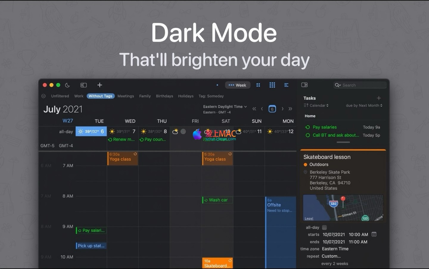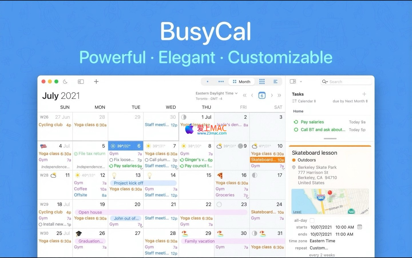 BusyCal 是 macOS 平台上功能最强大、设计最灵活且运行最可靠的日历应用程序之一。它集成了多项创新功能,旨在帮助用户高效管理时间,提升日程安排与任务处理效率。其核心功能包括:高度自定义的视图、集成任务管理、智能出行时间规划、自然语言输入、实时天气与月相显示、图形化标记以及智能筛选器等。