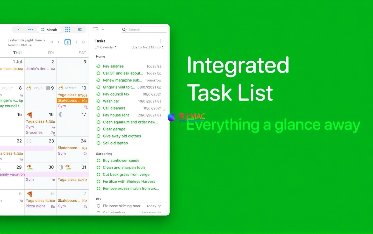 任务功能与日历无缝集成,任务会显示在对应的到期日期或时间,并持续可见直至完成。任务列表可在侧边栏显示,并与 macOS 及 iOS 的“提醒事项”应用同步,确保跨设备一致性。