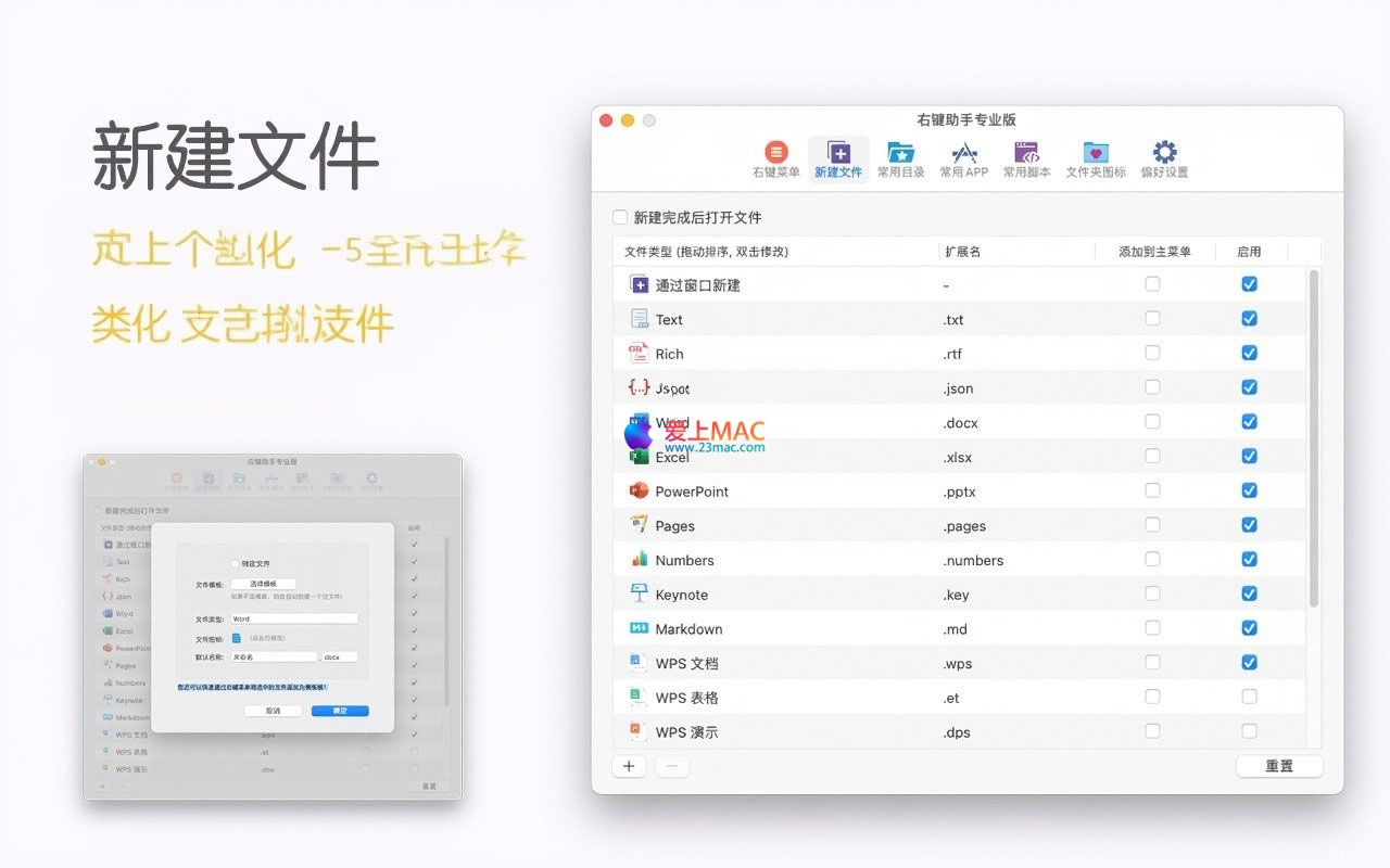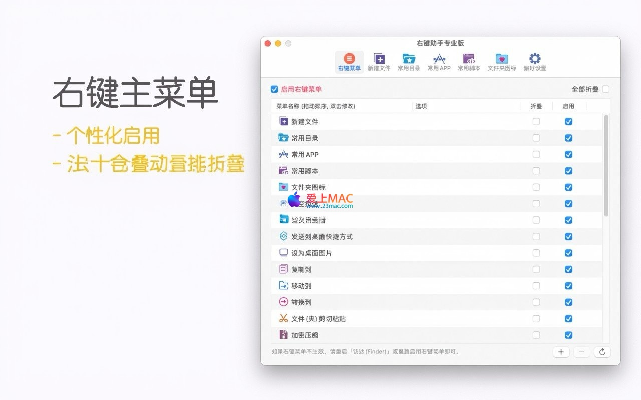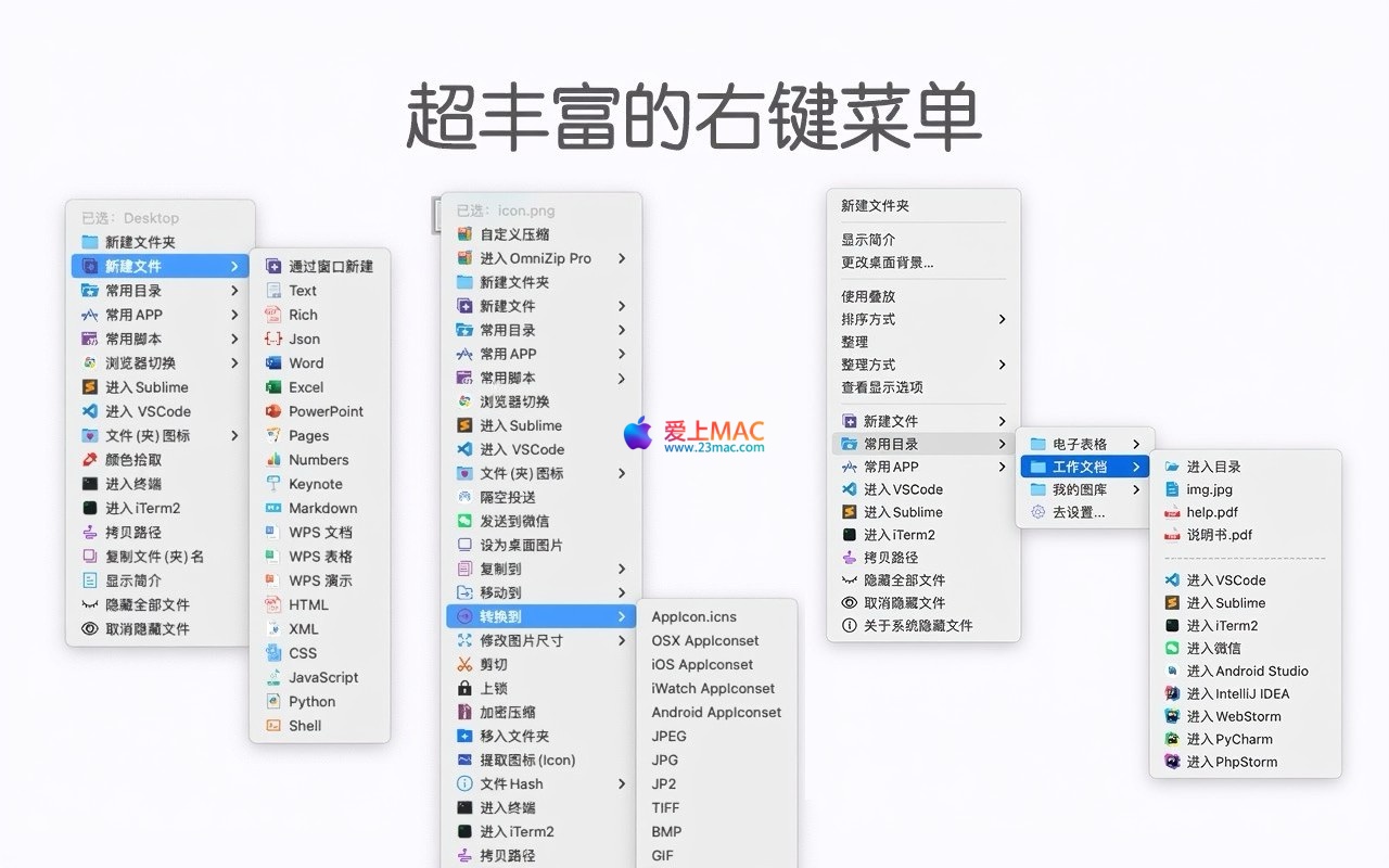 .gitignore),满足快速创建需求。cd步骤。.icns格式,并支持PNG、JPEG、GIF等格式的批量转换。软件提供了强大的自定义能力:用户可自由调整右键菜单项的排列顺序,禁用不常用的功能以保持菜单简洁。同时,支持将最常用的应用程序和文件创建模板置顶于主菜单,并可自定义菜单项的名称,使其完全贴合个人使用习惯。
