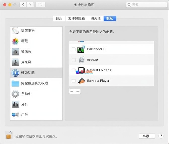 操作路径:系统偏好设置 → 安全性与隐私 → 隐私 → 辅助功能 → 勾选 “Breeze”。