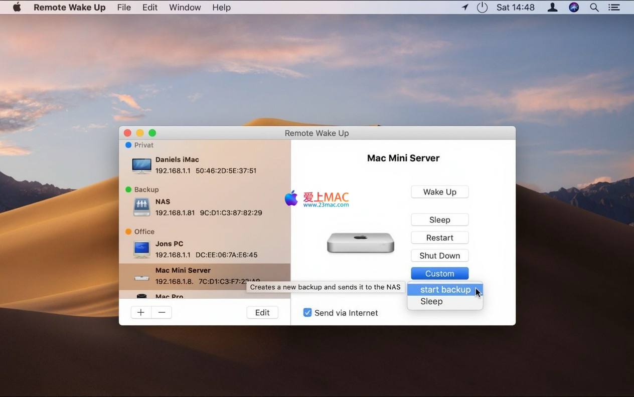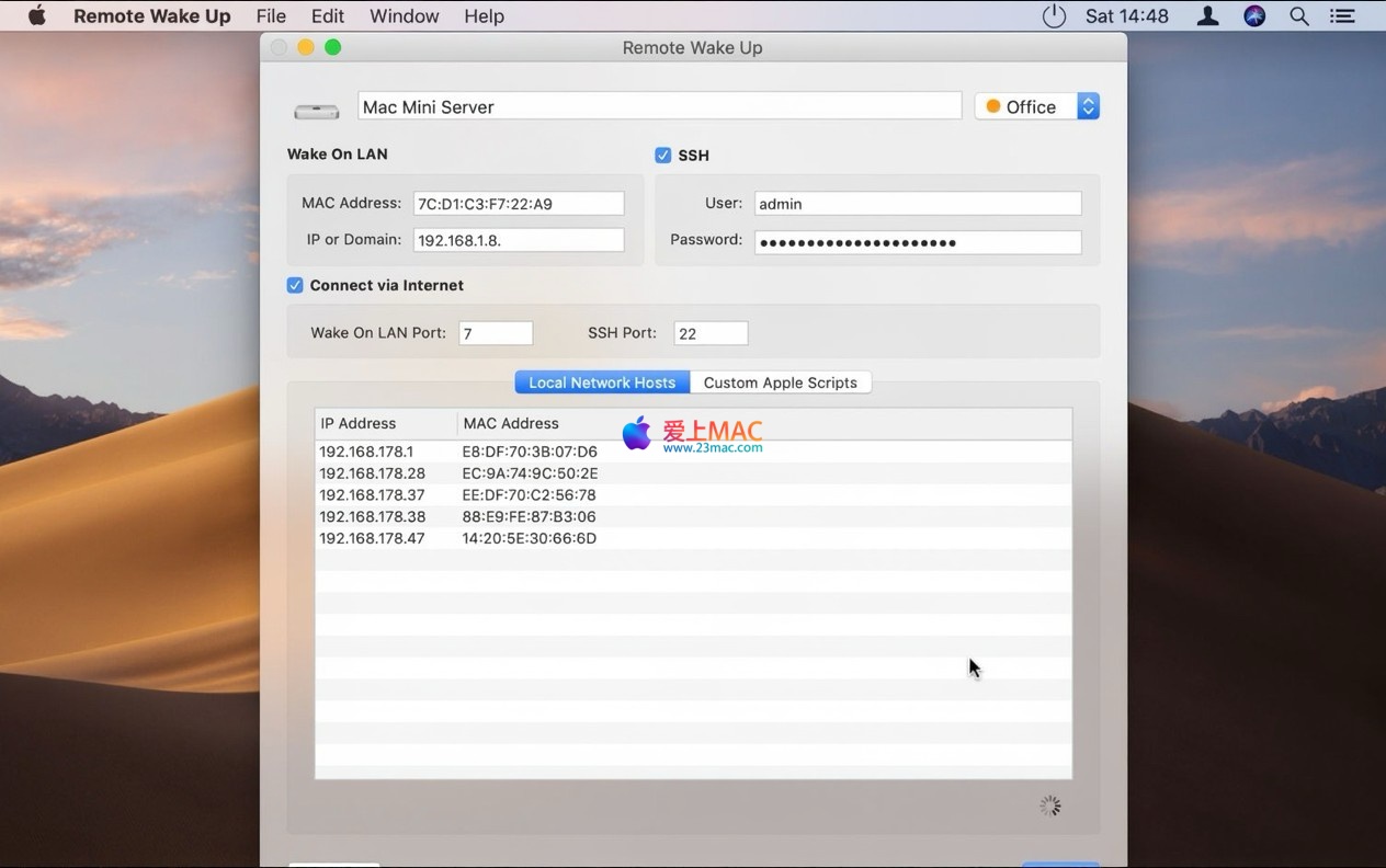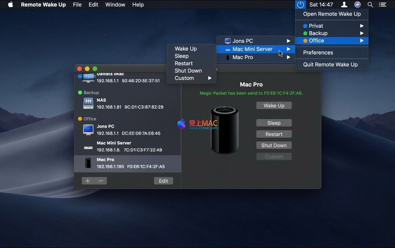 以下为 Remote Wake Up for Mac v1.3.1 的软件界面截图,展示了其主界面、设备列表及设置选项。