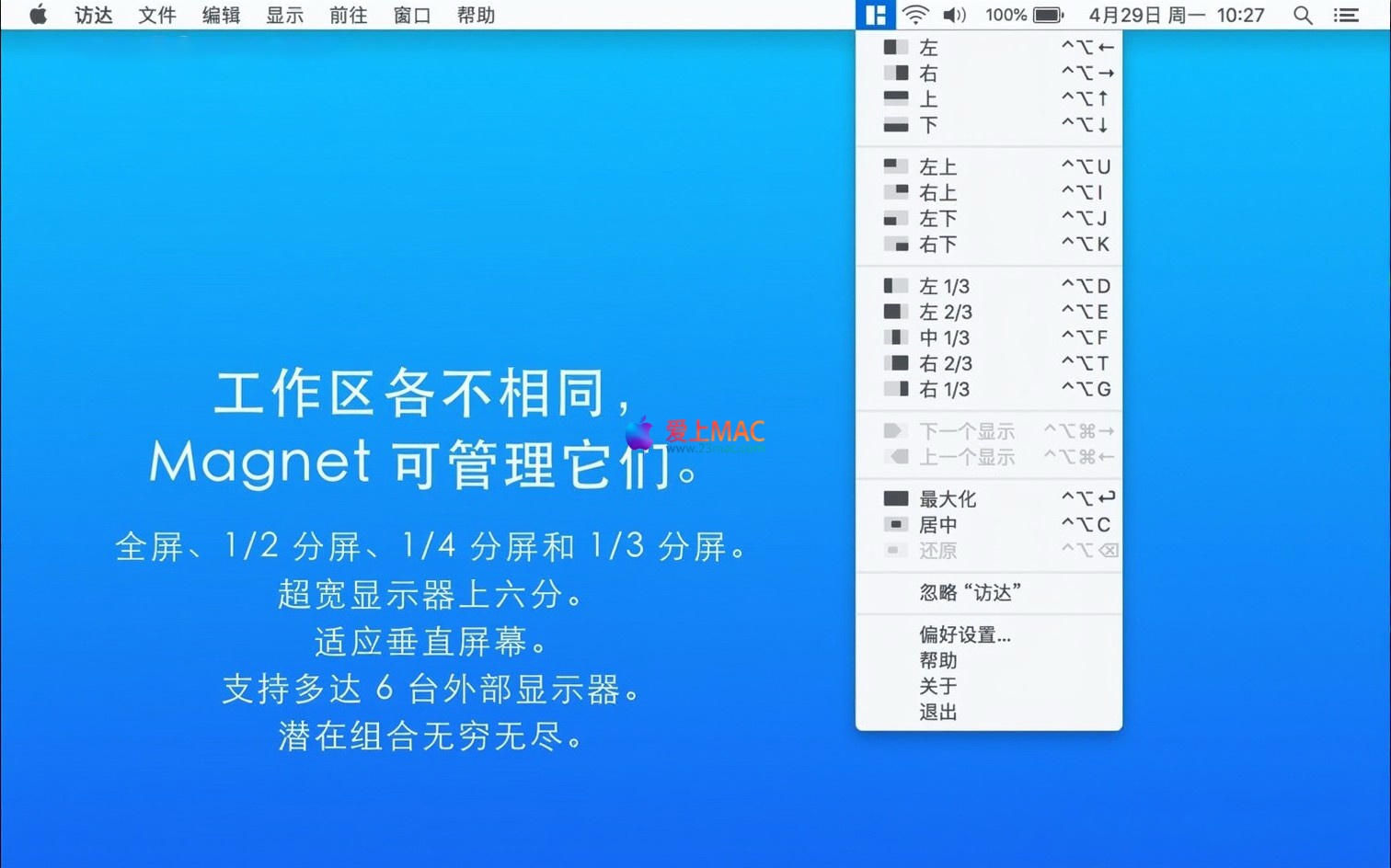 下方为 Magnet for Mac v2.4.2 的实际操作界面截图,展示其布局效果与设置选项: