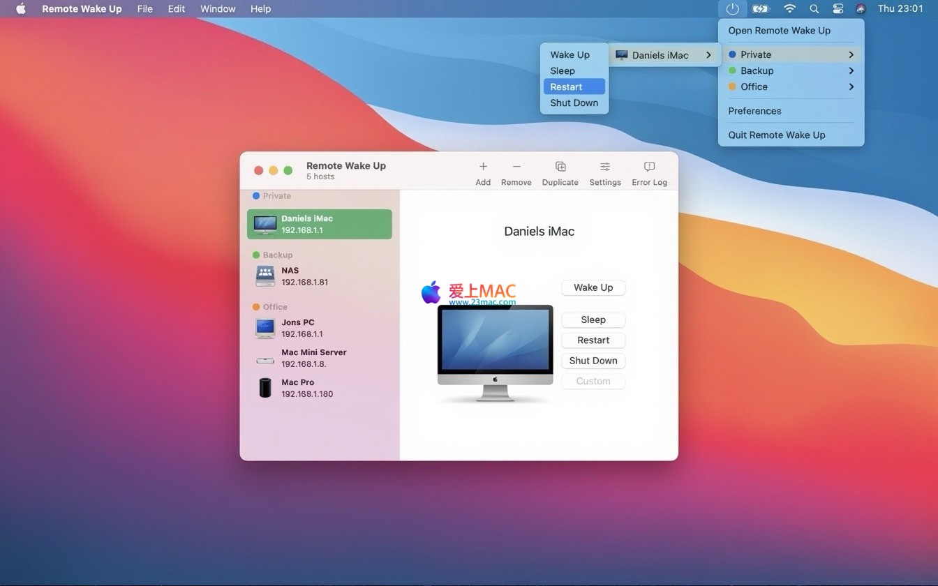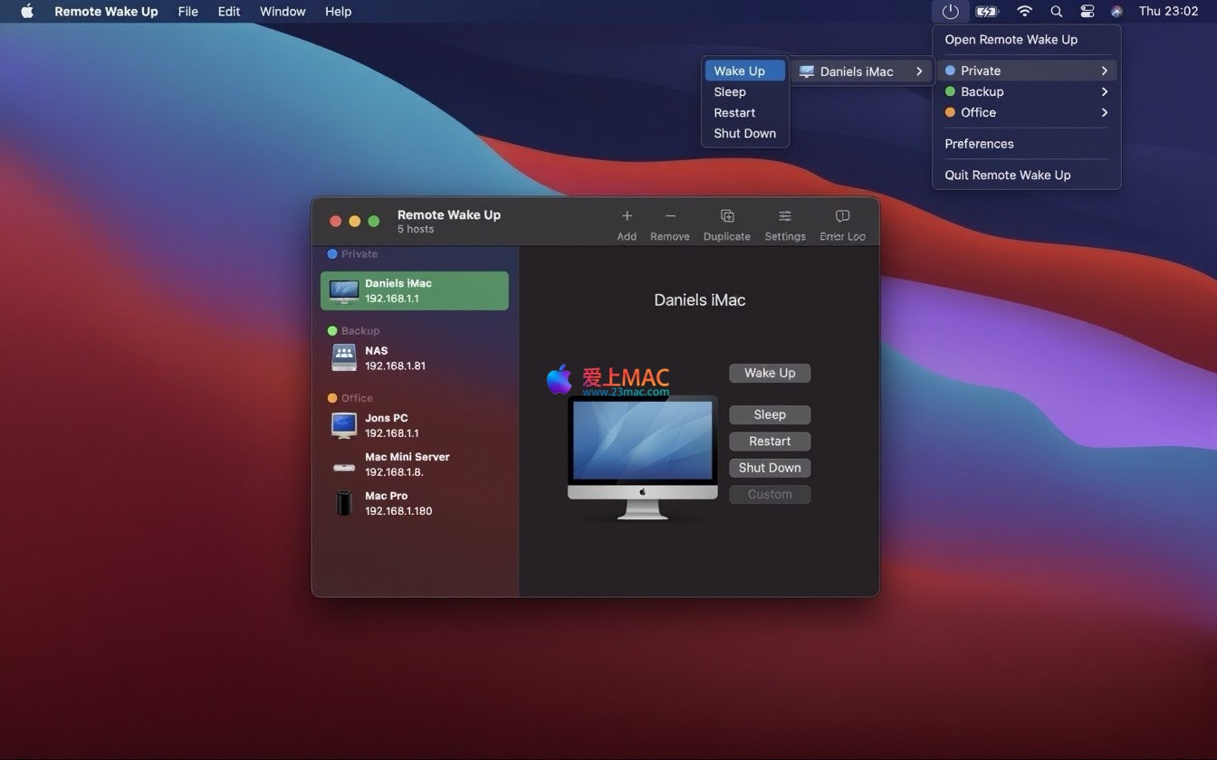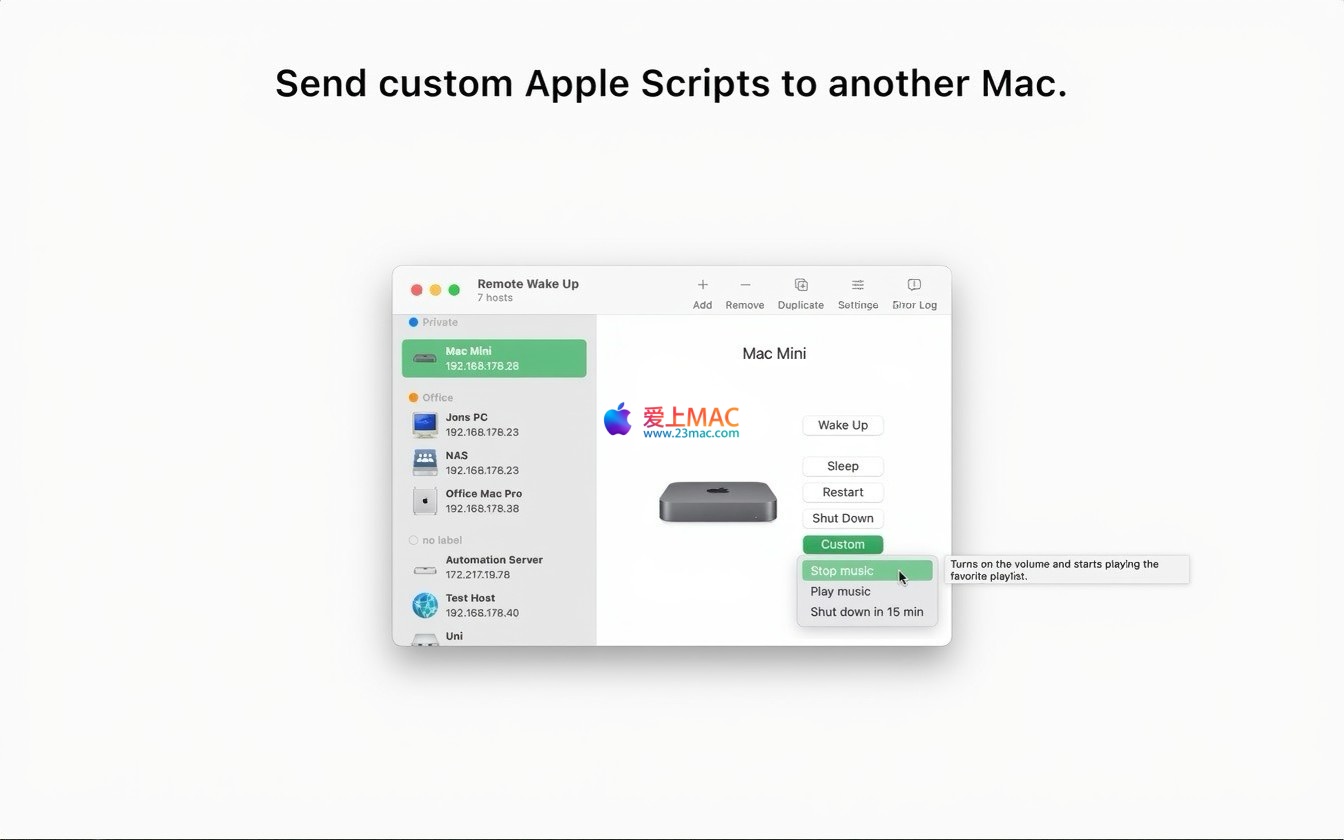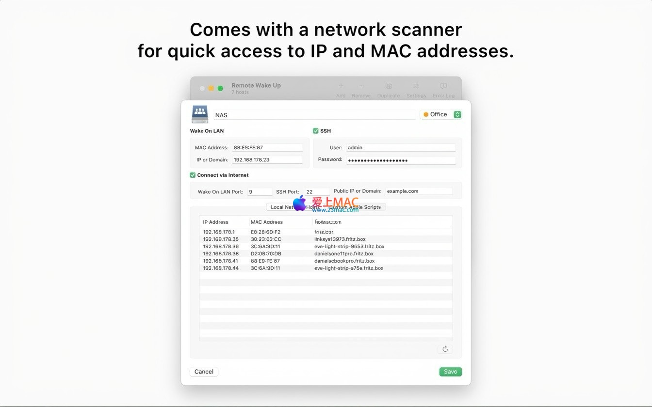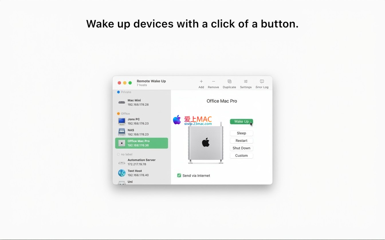 Remote Wake Up for Mac 是一款功能强大的远程管理工具,专为 macOS 系统设计。它支持通过局域网(LAN)或互联网(WAN),对任何兼容 Wake-on-LAN(WOL)技术的设备执行远程唤醒操作。此外,该软件还提供了包括重启、关机、睡眠在内的多种电源管理功能,并支持通过 SSH 连接发送 AppleScript 脚本,以实现更高级的自动化任务。