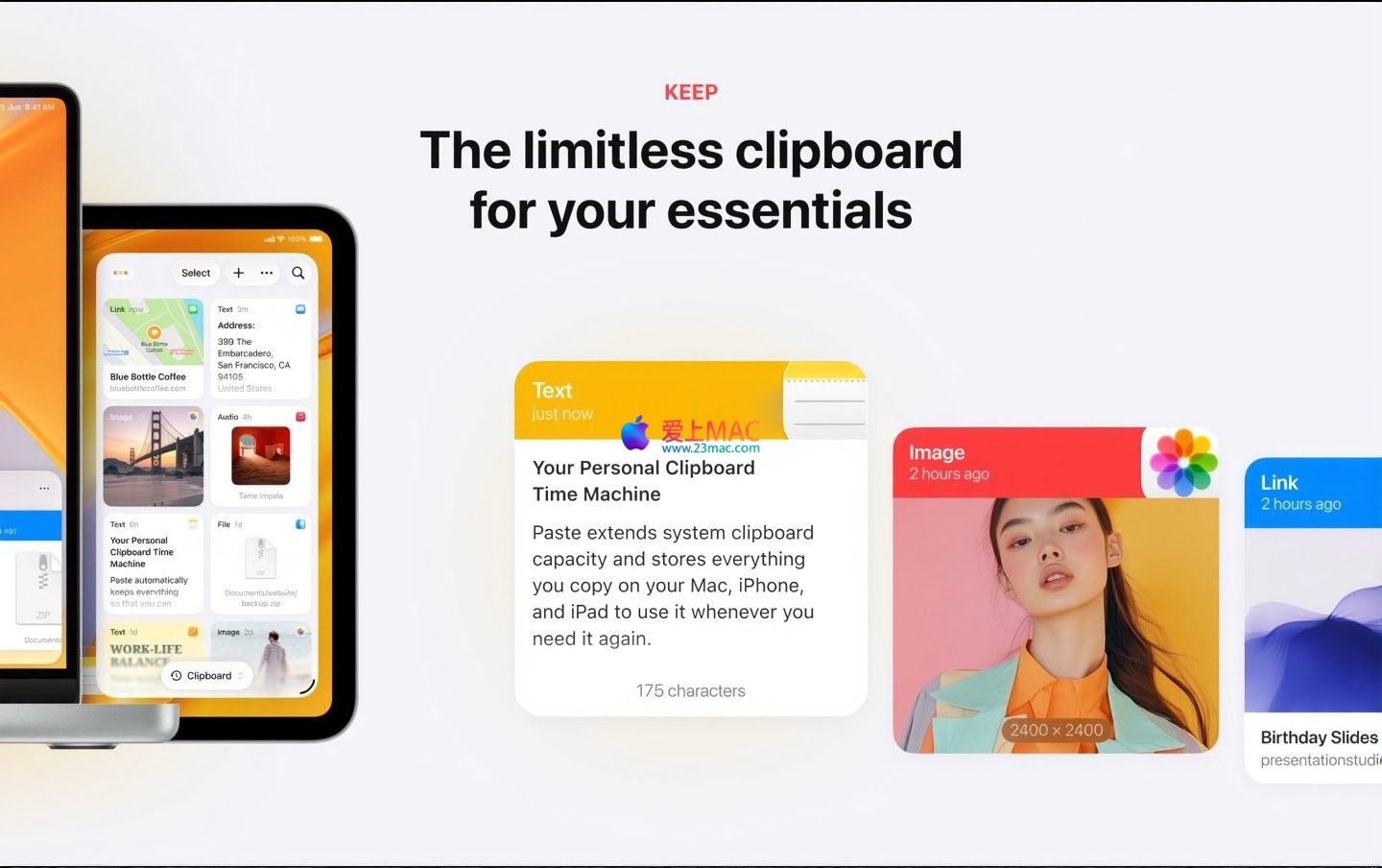 通过 iCloud 实现无缝同步,让您无论在 Mac、iPhone 还是 iPad 上,都能随时访问所有复制内容。
