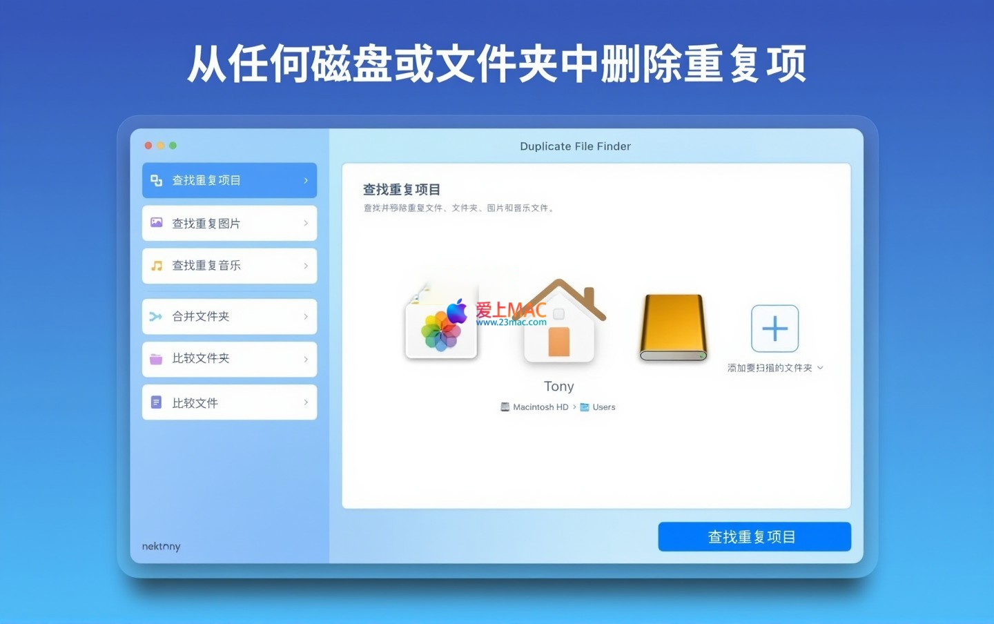 Duplicate File Finder 是一款专为 macOS 设计的强大工具,旨在帮助用户通过识别并删除系统中不必要的重复文件和文件夹,快速、安全地释放宝贵的磁盘空间。它支持扫描任何已挂载的磁盘、文件夹及照片库,是优化存储管理的理想选择。