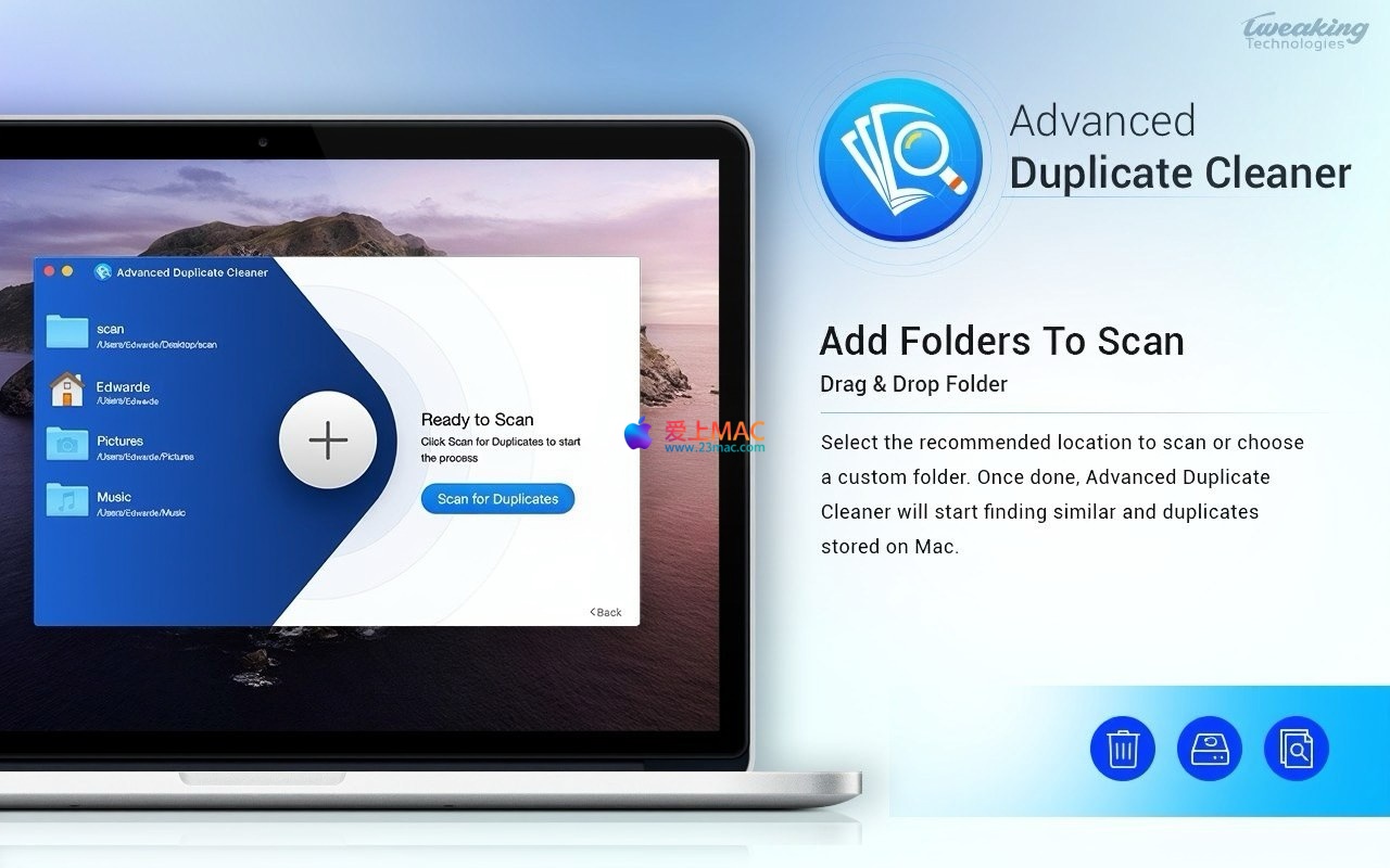 Advanced Duplicate Cleaner for Mac 是一款专业的智能工具,旨在精准识别并清理Mac系统中的重复及相似文件。它能全面扫描您的Mac,高效查找重复或近似的文档、照片、视频、音乐、应用程序等多种文件类型。用户既可从软件推荐的位置启动扫描,也可自定义添加任意文件夹进行检测。无论文件格式如何,该工具均能准确识别并将其归类,帮助您系统化地管理存储空间。对于希望高效管理文件、避免冗余的用户而言,Advanced Duplicate Cleaner 是理想的选择。