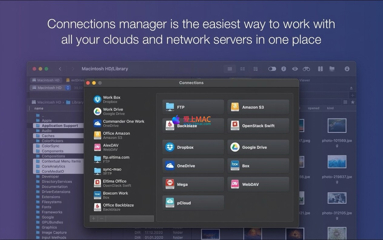 Commander One PRO 内置了强大的客户端,支持访问多种远程存储和云服务。
