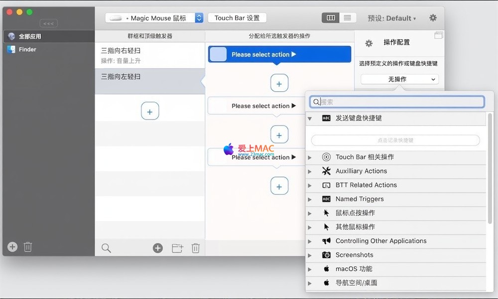 通过“手势”面板,用户可以为 Magic Mouse、触控板、键盘乃至普通鼠标定义几乎任何操作。软件还兼容 Apple Remote、Leap Motion 等外部设备。